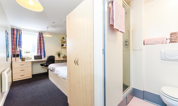 Communal kitchen and living space with up to 5 en-suite rooms per flat Small double bed Underbed storage, wardrobe, personal study space with desk and chair included in the room