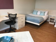 3/4 bed with underbed storage Ensuite bathroom with shower, toilet and basin Self-contained studio bedrooms with own kitchen and bathroom Fully equipped kitchen with combi-oven, kettle and toaster Washer/dryer machine included within studio rooms Personal study space with desk and chair