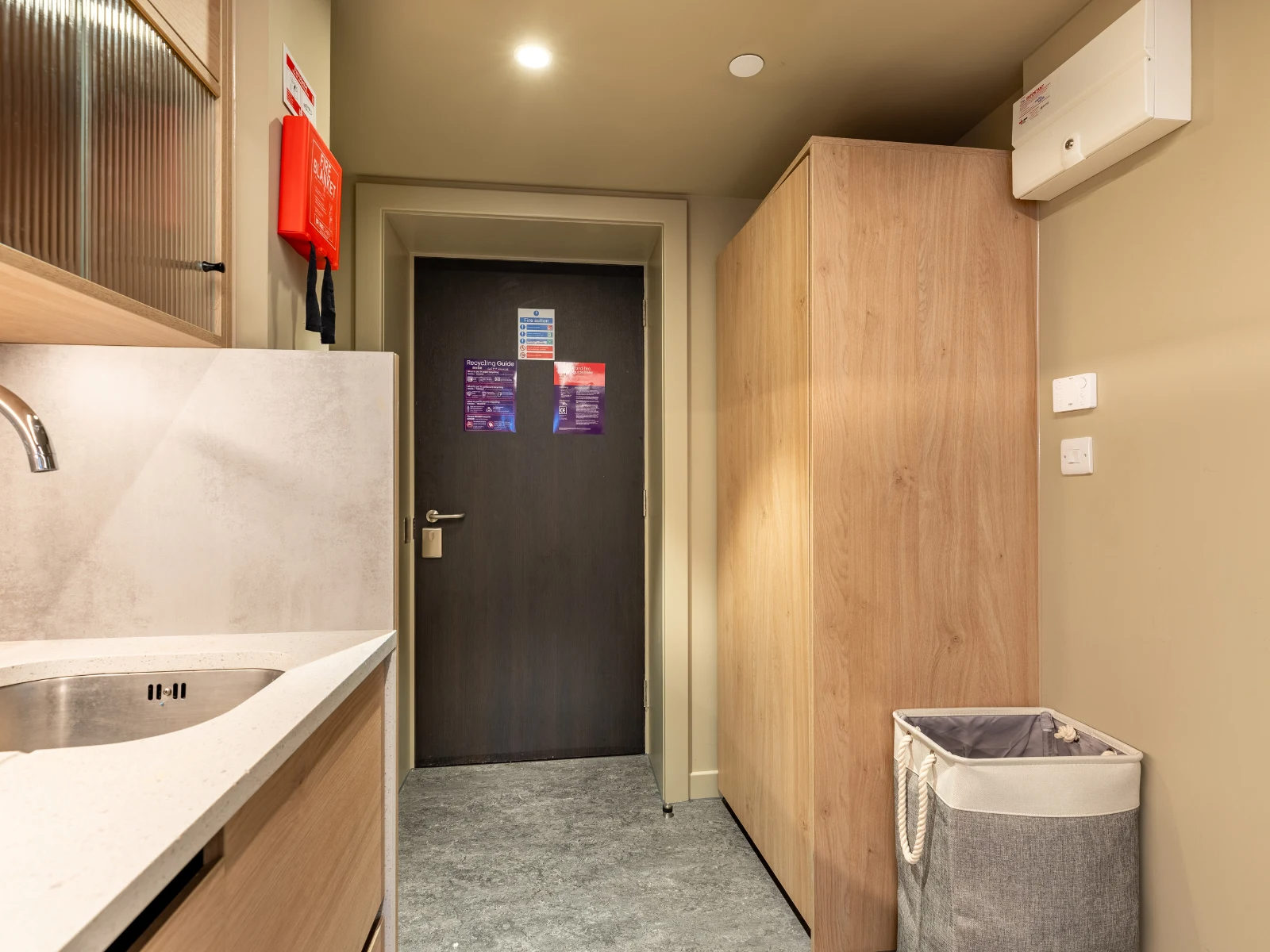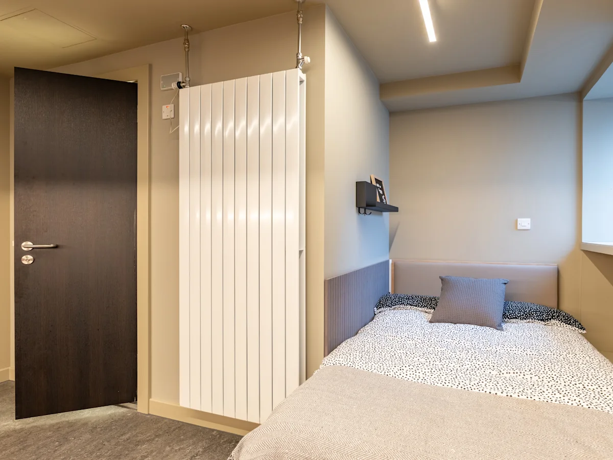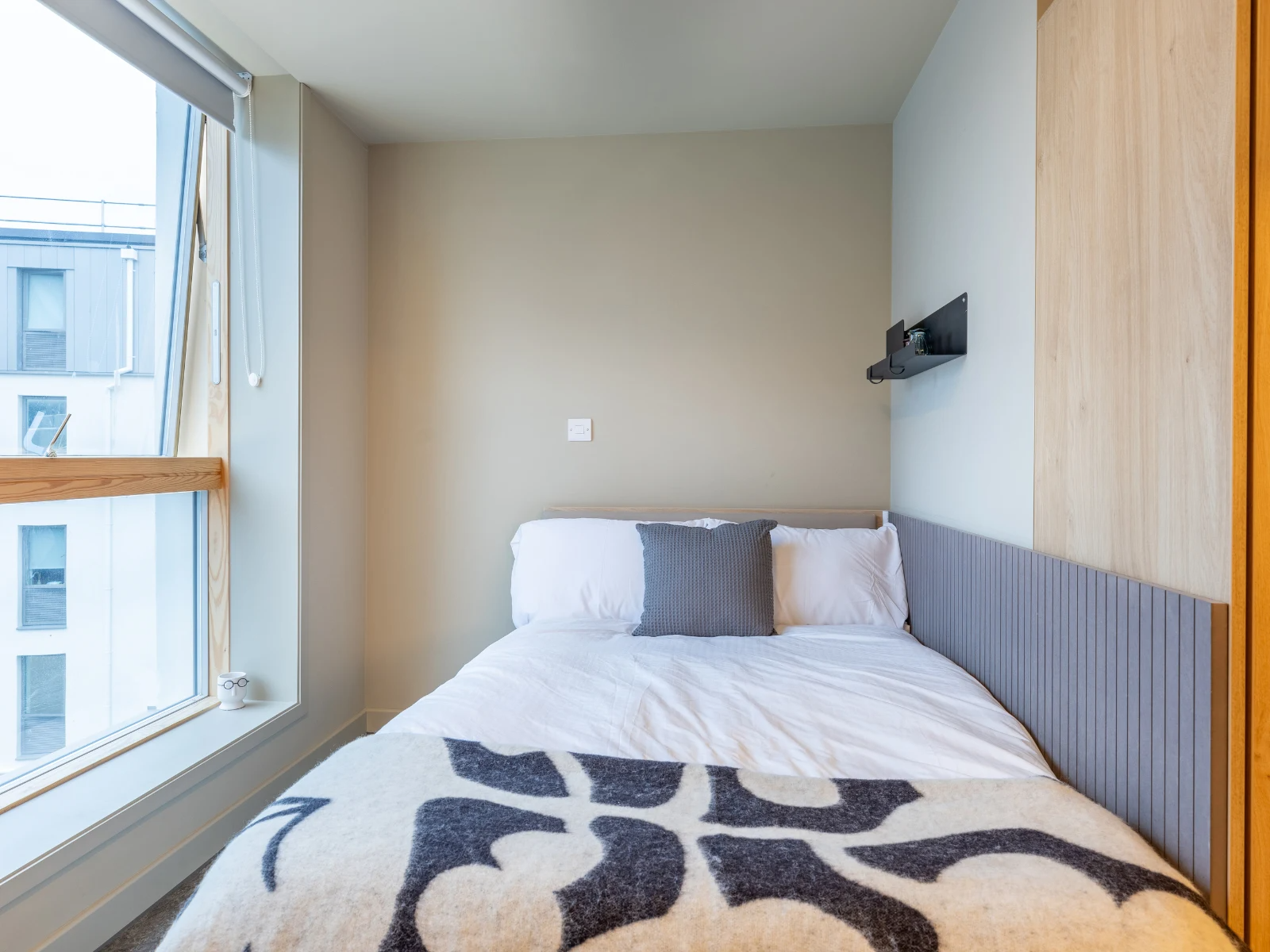 Located in the Potterrow 22A Building, with a double bed, loads of storage, plenty of work space, en suite shower and your own private mini-kitchen! Average room 18-19 sqm.
