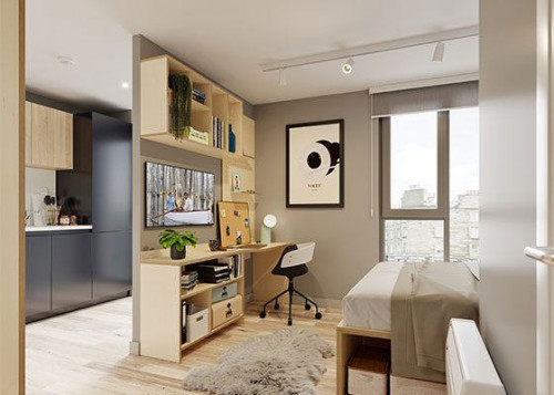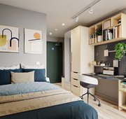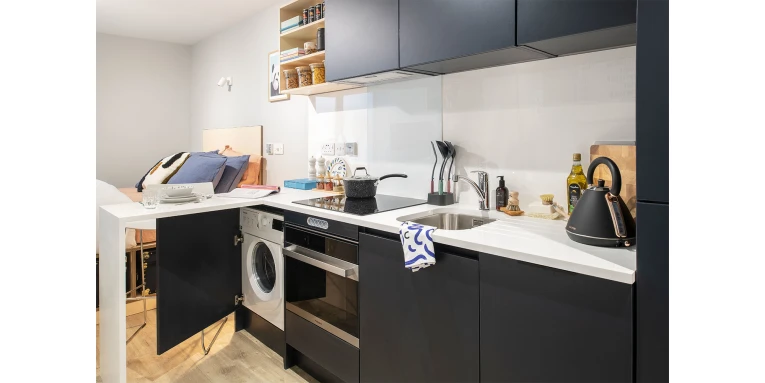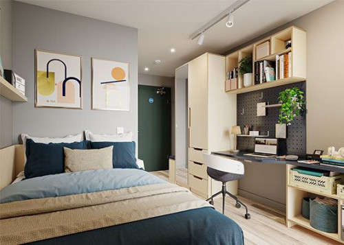 12.8 m² | Small double bed, desk chair, wardrobe, headboard shelving and underbed storage Shared living, kitchen and dining area, fully fitted kitchen, washing machine, tumble dryer, dishwasher, smart TV, sofa and dining table with chairs