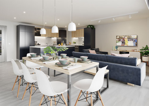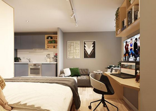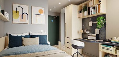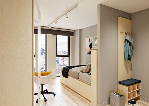 21-22.8m² | Double bed, desk chair, wardrobe, bedside table or shelving and underbed storage En-suite with a smart TV, fully fitted kitchen with an integrated washer-dryer, dishwasher, two-seater sofa, dining table and chairs or breakfast bar stool