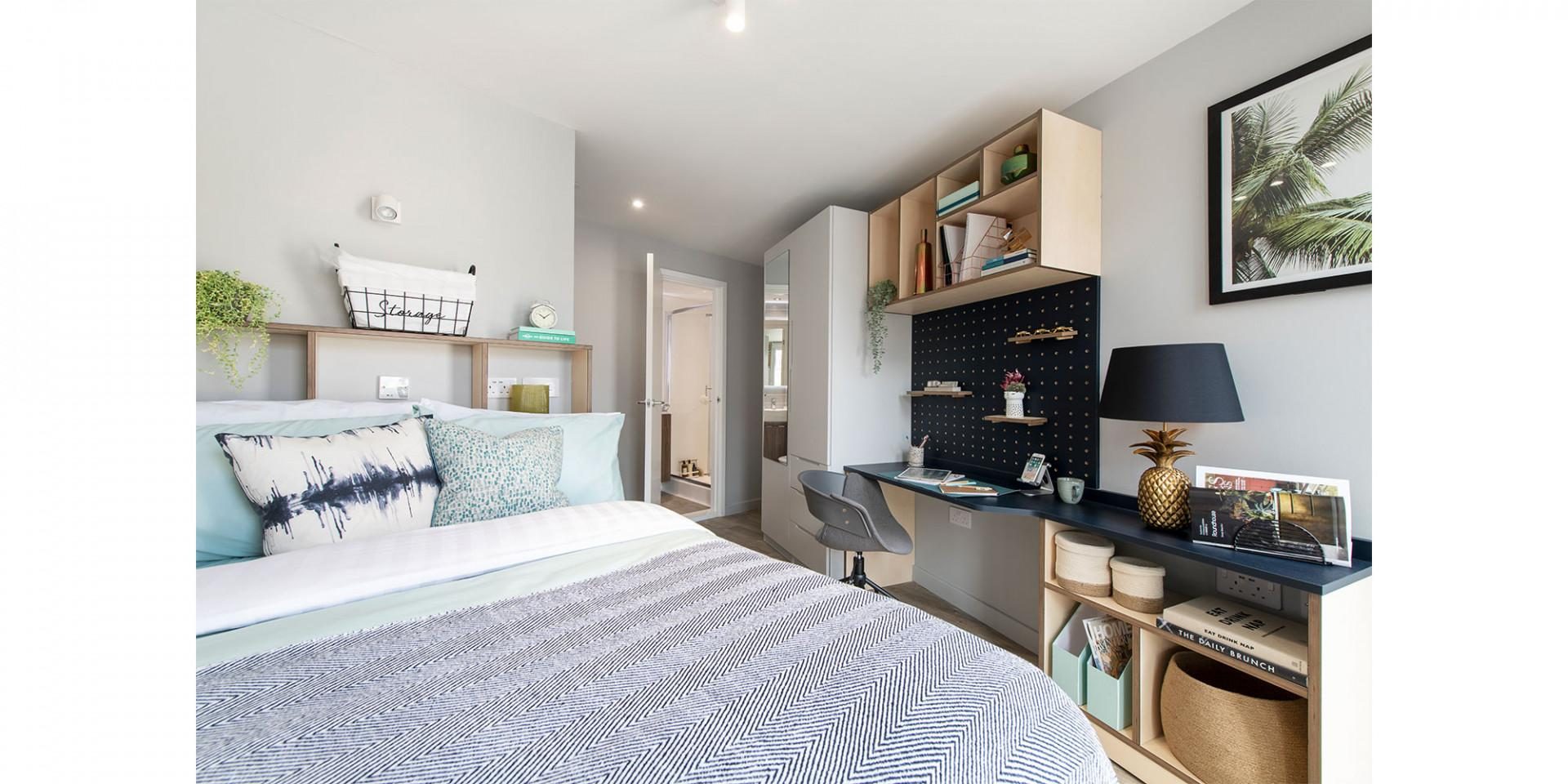 Embrace comfortable living in the standard en-suite room, ranging from 11.8m2 to 12.5m2. Featuring a cosy small double bed and a dedicated study area, this room offers the perfect space for rest and study. Stay organised with ample storage space, and enjoy the convenience of your own bathroom. Additionally, you’ll have access to an open-plan shared living, kitchen, and dining area, providing plenty of opportunities for socialising with fellow residents.