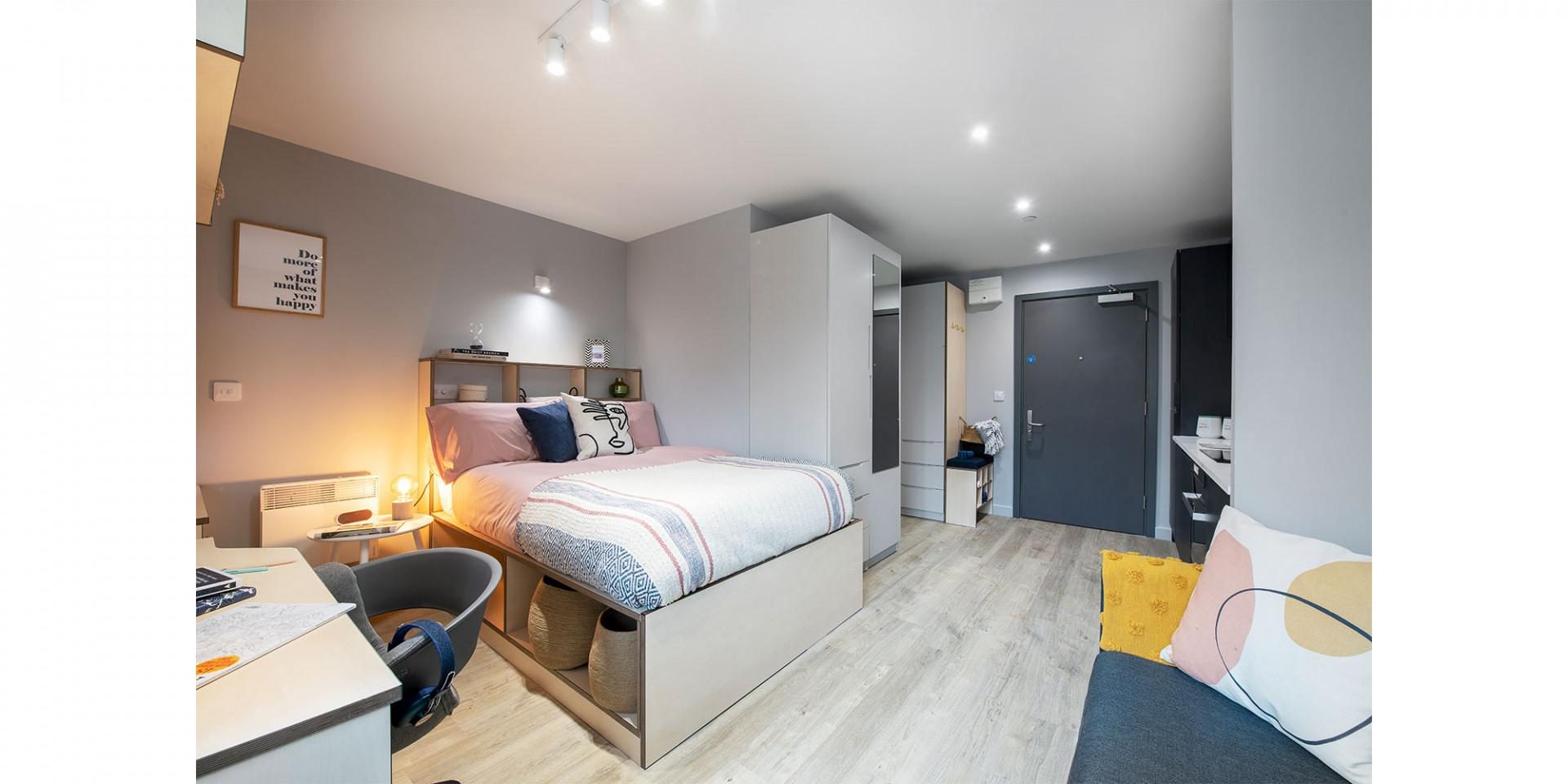 Enjoy independent living in your Standard Studio, featuring a double bed with room sizes ranging from 17.8m2 to 21.1m2. These studios are located on the 1st, 2nd, 3rd, and 4th floors of the student accommodation. Furnished with a smart TV and a dedicated study area, this studio provides the perfect space for relaxation and productivity. Stay organised with ample storage space, and enjoy the convenience of an en-suite bathroom and a private kitchen/dining area with integrated appliances, including a washer-dryer and dishwasher.