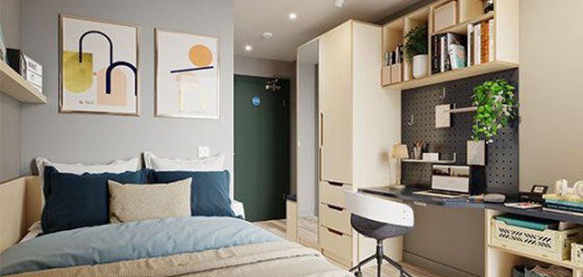12.8m² | Small double bed, desk chair, wardrobe, headboard shelving and underbed storage Shared living, kitchen and dining area, fully fitted kitchen, washing machine, tumble dryer, dishwasher, smart TV, sofa and dining table with chairs