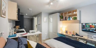 17.9-21m² | Double bed, desk chair, wardrobe, bedside table or shelving and underbed storage En-suite with a smart TV, fully fitted kitchen with an integrated washer-dryer, dishwasher and breakfast bar stool