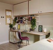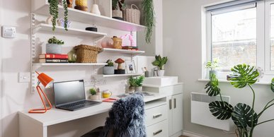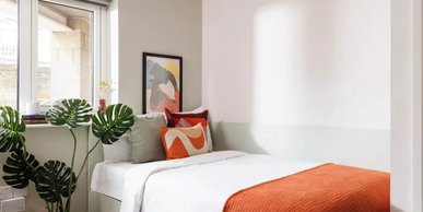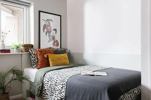 The Bridge House is home to 319 students, all living in non en-suite rooms in shared flats. That means you’ll have your own bedroom (with wash basin), complete with study and storage space, and you’ll share your bathroom, kitchen, and lounge with flatmates.