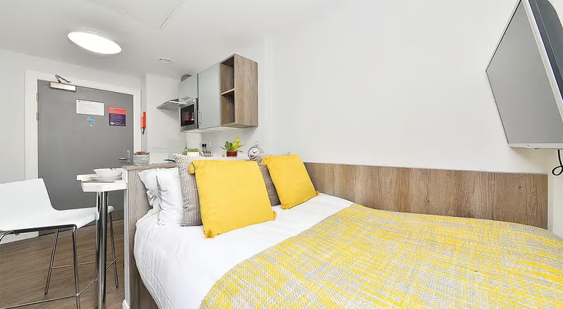 Shared apartments feature a roomy work area with a comfy double bed, bags of storage, an en suite shower room, and a shared kitchen/living space kitted out with a snazzy flat-screen TV. If you’d prefer a little more privacy, our fantastic studios come with a cozy double bed, your very own TV, plenty of storage, and a mini kitchen with a cute dining area. When you fancy catching up with your buddies (or making new ones) you can head down to our amazing indoor and outdoor social space, or break a sweat at the on-site gym if you’re feeling active. Relax at ease in your new stylish home where your safety is fully ensured with a dedicated on-site team and CCTV. With fast Wi-Fi and all bills included, you needn’t stress over any unwanted bills or running out of hot water!