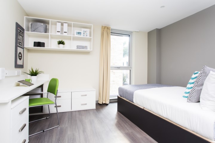 This 13m2 en-suite room features a small double bed, workspace, and access to a shared modern fully fitted kitchen with a lounge area. The communal area is shared with an average of 4-9 students.