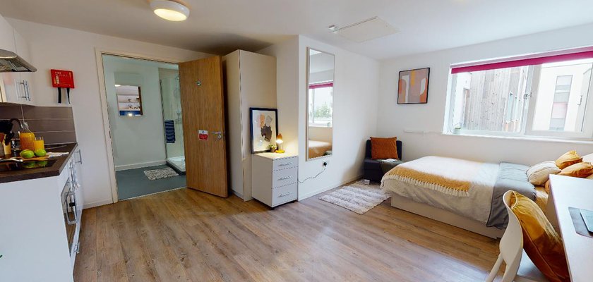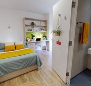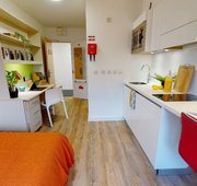 TPAD300-031125These self-contained studios on our lower floors offer privacy and convenience in a close-to-campus location. A bronze studio offers all the features of our en suite rooms, along with some great extras. You'll have a bed, study area, storage and en suite shower room, as well as your own kitchenette with combi-oven, hob, fridge and dining area. Our onsite social and study areas are also available for your use anytime.