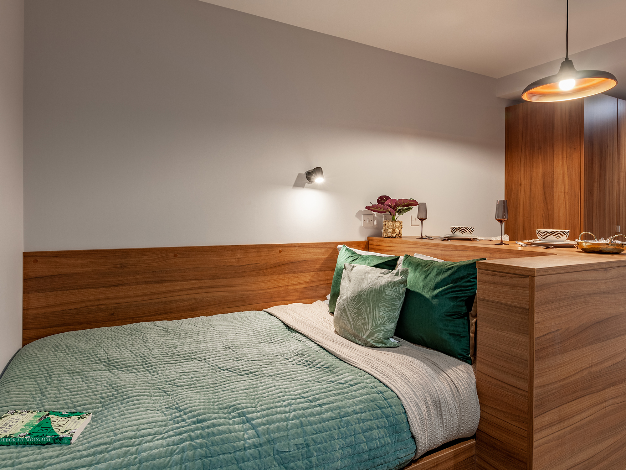 For students wanting a modern and chic student apartment furnished with all the amenities they could need, our Deluxe Plus Studio is the perfect option. Slightly larger in size than our Deluxe option, this room style features a snug double bed for resting up after a busy day, a large study desk for cracking on with work, as well as your own fully-equipped kitchen for cooking up something tasty. Some studio styles at Straits Garden are designed as accessible rooms with wet rooms, get in touch to discuss more.