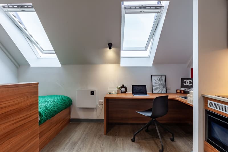 Measuring from around 14m2, feel right at home in our classic studio higher floor which has been designed for the modern student. Sink into your comfortable double bed, and when it’s time to focus, sit at your very own study desk and concentrate with no distractions. Fancy a bite to eat? Show off your cooking skills in your brand new kitchen! Who knows, you could become the next Gordan Ramsay…