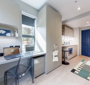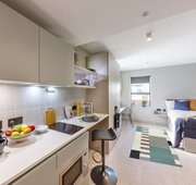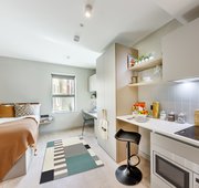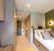 Our Deluxe Studio is our luxurious student accommodation located first floor with a comfortable bed with storage underneath and plenty of room space which measures 24m² for residents to create the perfect home away from home. Cook a delicious meal in your very own private kitchen and wind down on an evening in a relaxing environment. With a study area you can focus on university work with ease. Students can also take advantage of their very own bathroom and a spacious wardrobe.