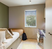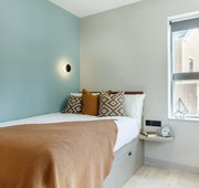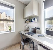 These shared apartments are all located on upper floors, you will share the apartment with 3 other students so you can make new friends in no time! The almost full-height windows will give a great outlook to our fully landscaped gardens! It features your very own personal bathroom, a study area to promote focus and concentration, and a large comfortable bed with storage underneath! This room is designed with good space to allow you to live comfortably in a comfy setting. Cook a delicious meal in the shared kitchen, and wind down in the evening in your cozy room or with your flatmates in the lounge area.