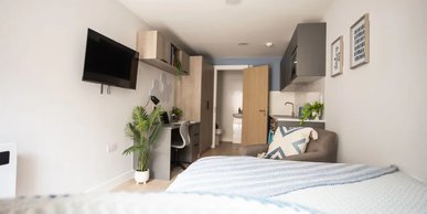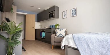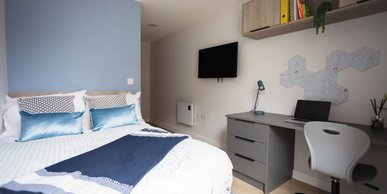 Room sizes may vary from 29.2m2 - 31.2m2 - Bed - Chair & desk - Wardrobe - Private en-suite - Private kitchen with hob, oven fridge/freezer - Free dual occupancy! Subject to availability, speak to the site team for more information.