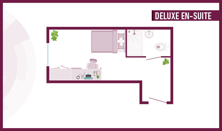 Room sizes may vary from 18.3m2 - 19.6m2 - Bed - Chair & desk - Wardrobe - Storage - Private en-suite - What's in the shared kitchen? - Deluxe En-suite rooms are in shared flats of 6 - Shared kitchen with hob oven, fridge/freezer - Plenty of storage space - Dining table and seating - Lounge area with coffee table