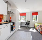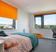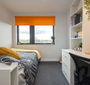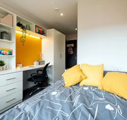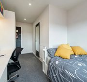 3/4 size double bed with under bed storage - Study desk - Desk chair - Wardrobe - Drawers - Multiple storage shelves - Private e n-suite shower - Coat hooks on door - Keyless entry - Bedside plug sockets - Window blinds - TVs in all communal living spaces - Shared kitchen - Description - Room sizes vary from 12.3m to 15.4m