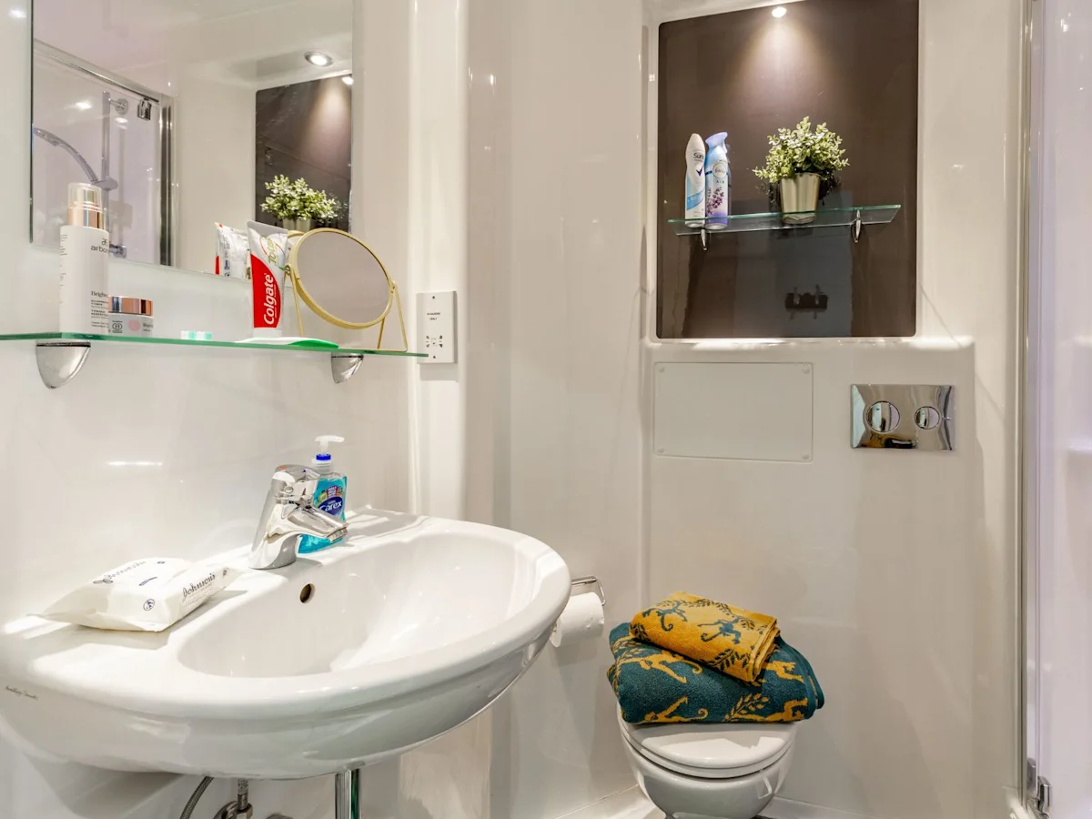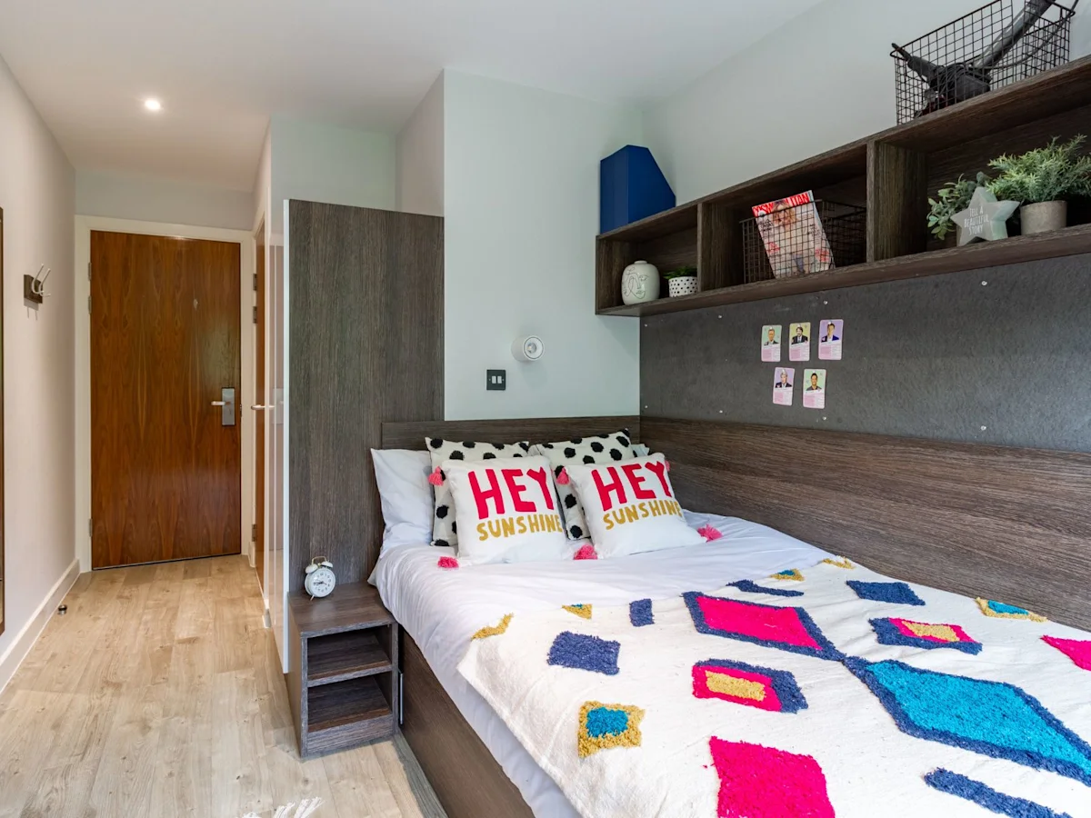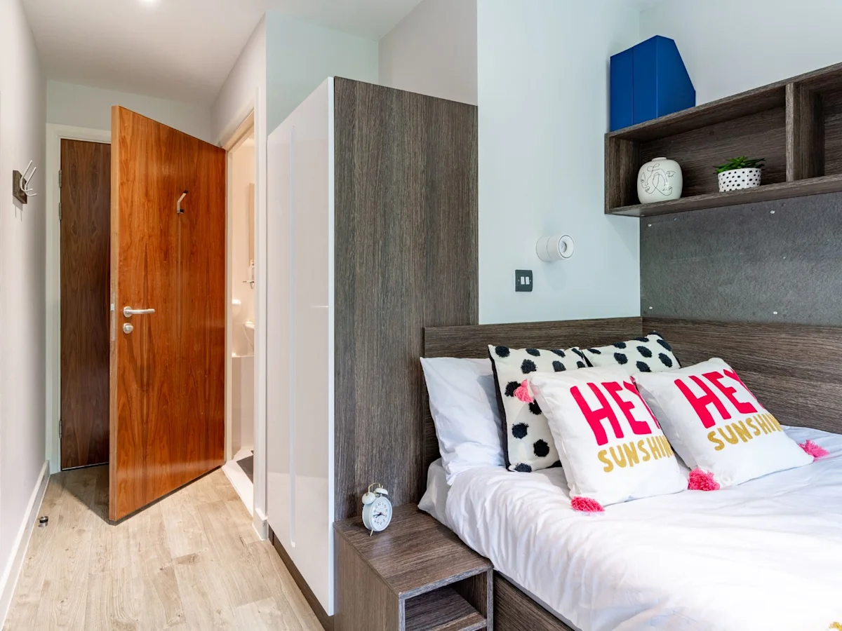 Our most affordable rooms - with a small double bed alongside your own en suite shower room, ample storage and a shared kitchen/living room.