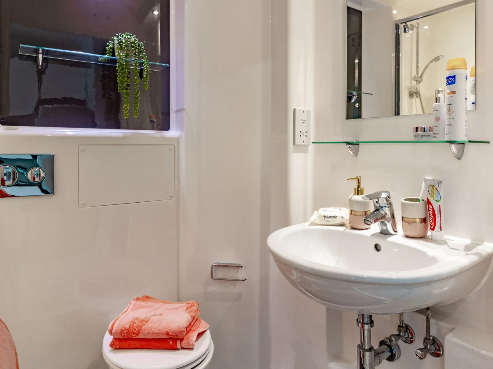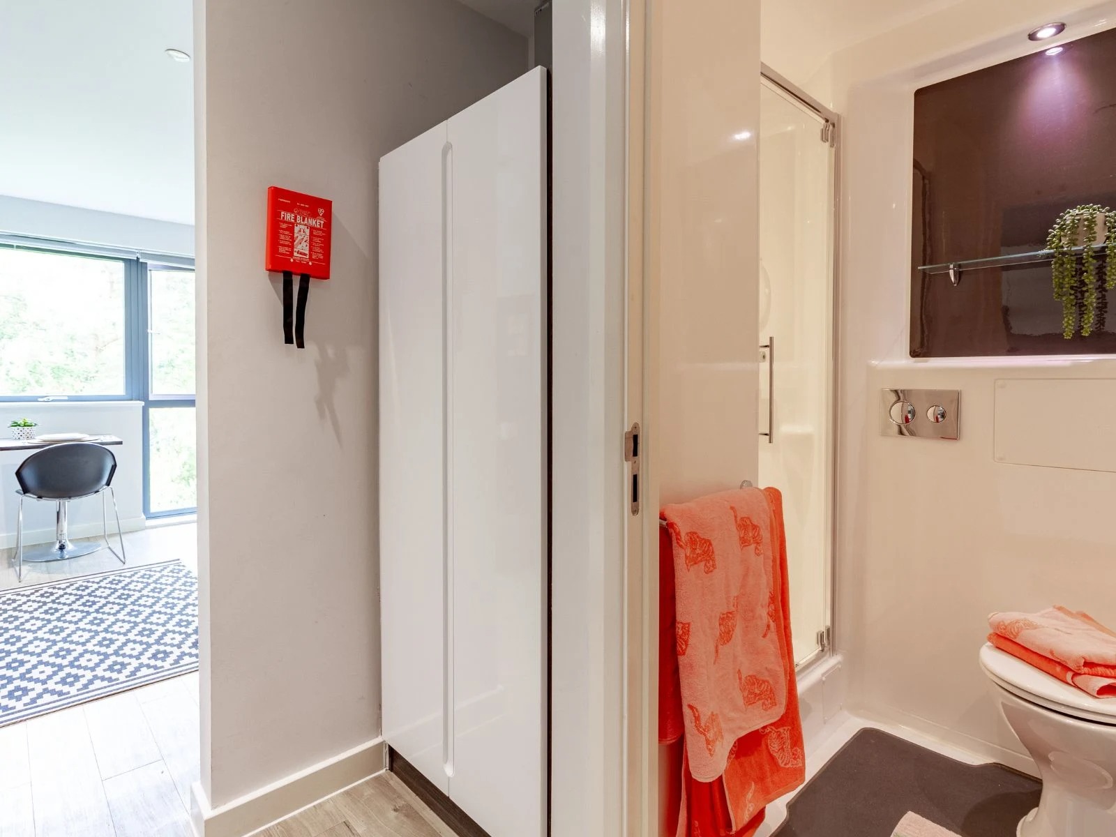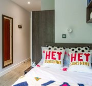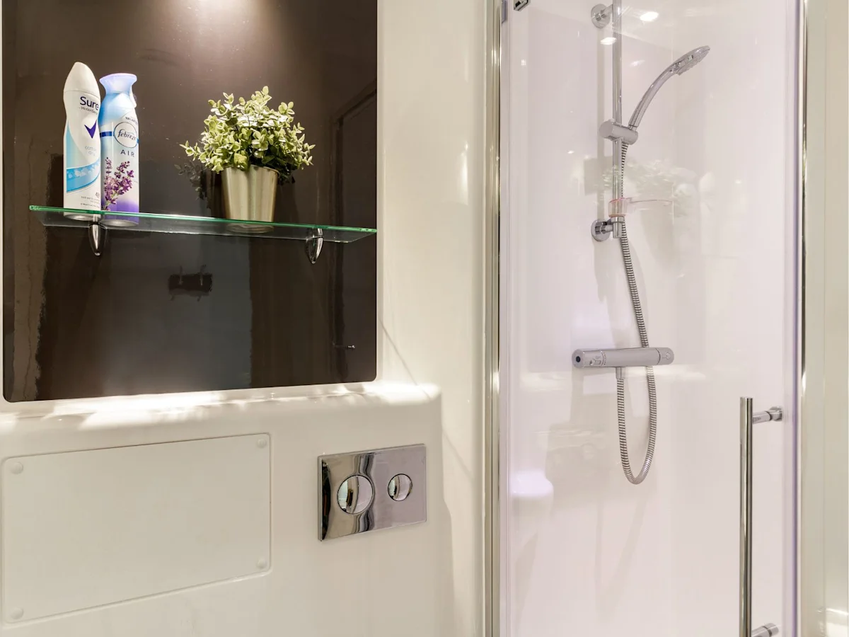 Our most affordable rooms - with a small double bed alongside your own en suite shower room, ample storage and a shared kitchen/living room.