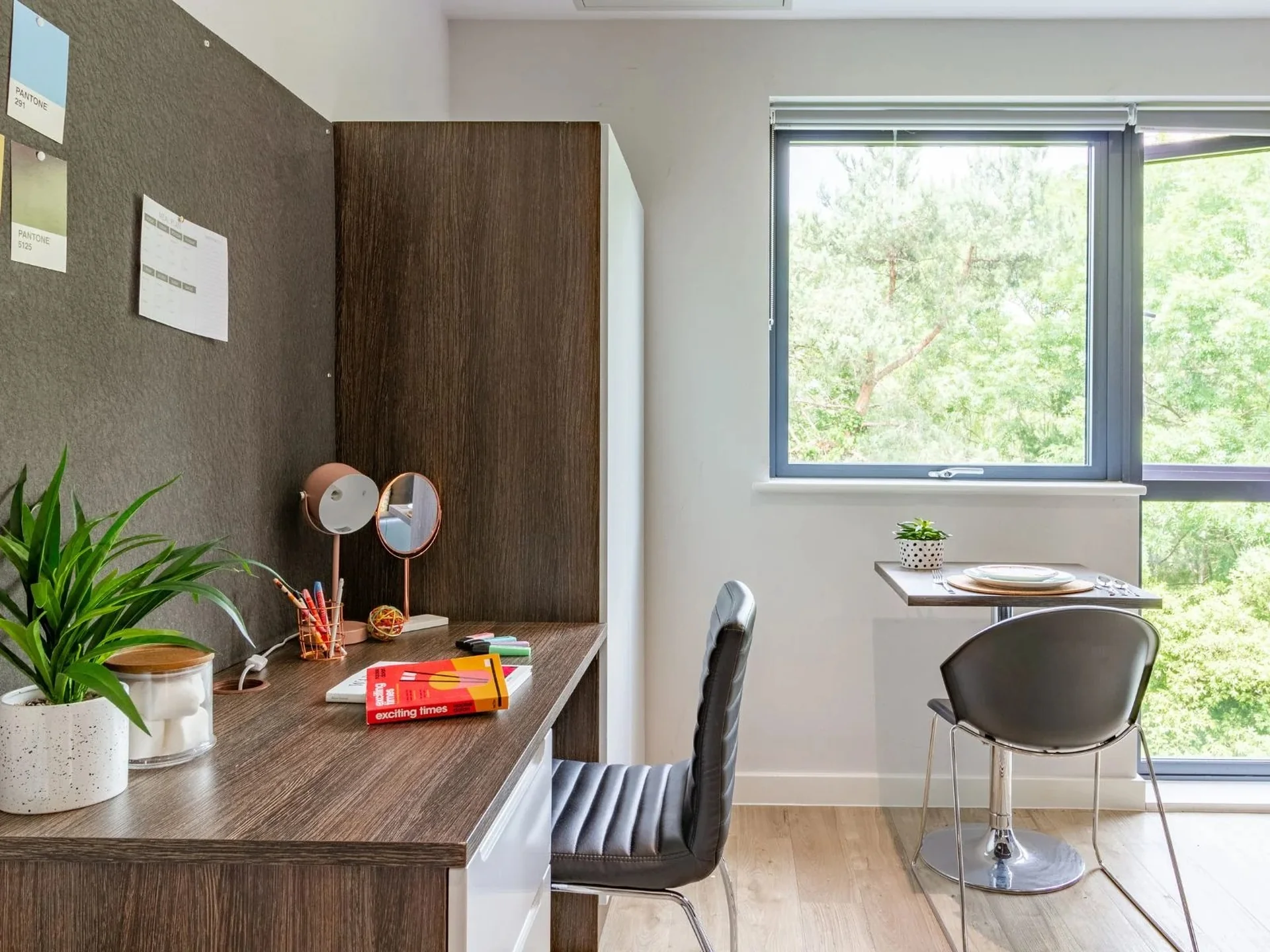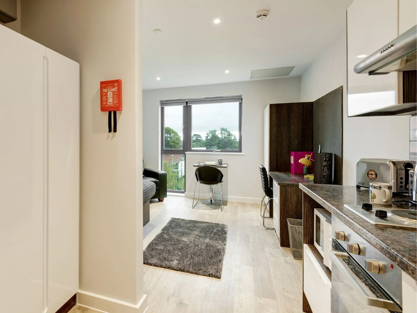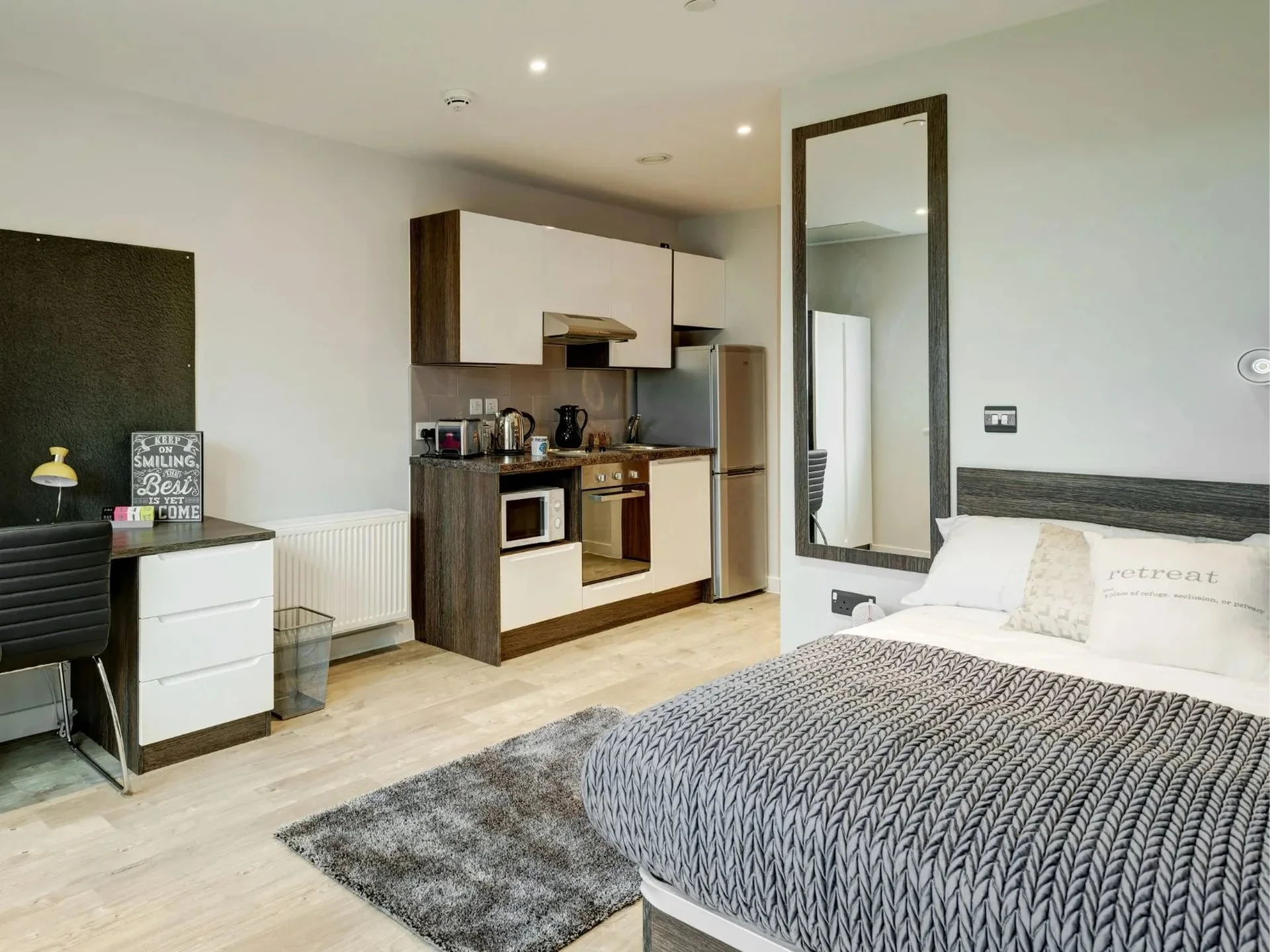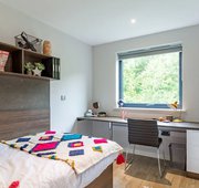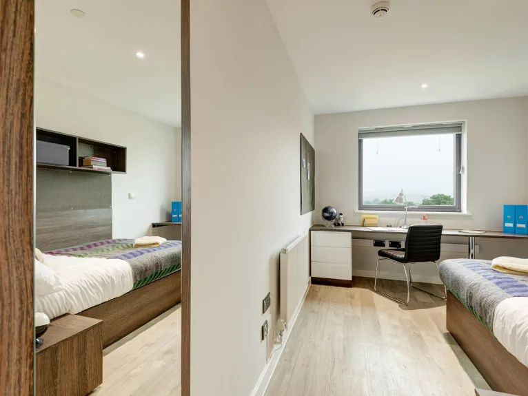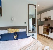 Your own private studio with quality fixtures and fittings, featuring an en suite shower room, small double bed, storage, fitted kitchen, and study area. Ideal if you're flying solo and like to spread out or plenty of space for couples to share at no extra charge. Average room 19-21 sqm.