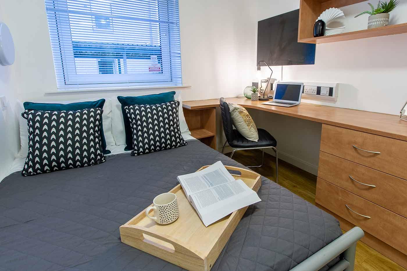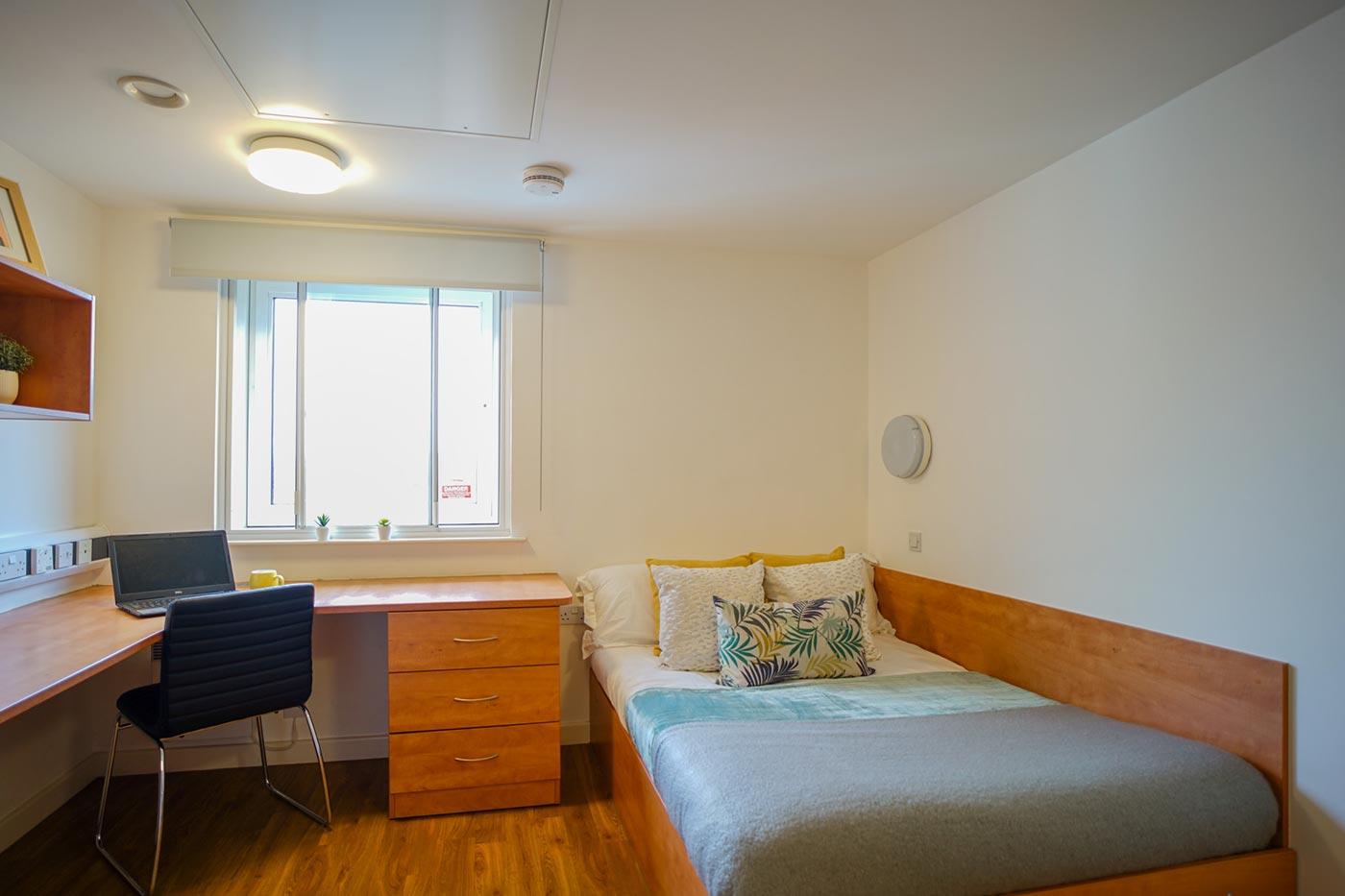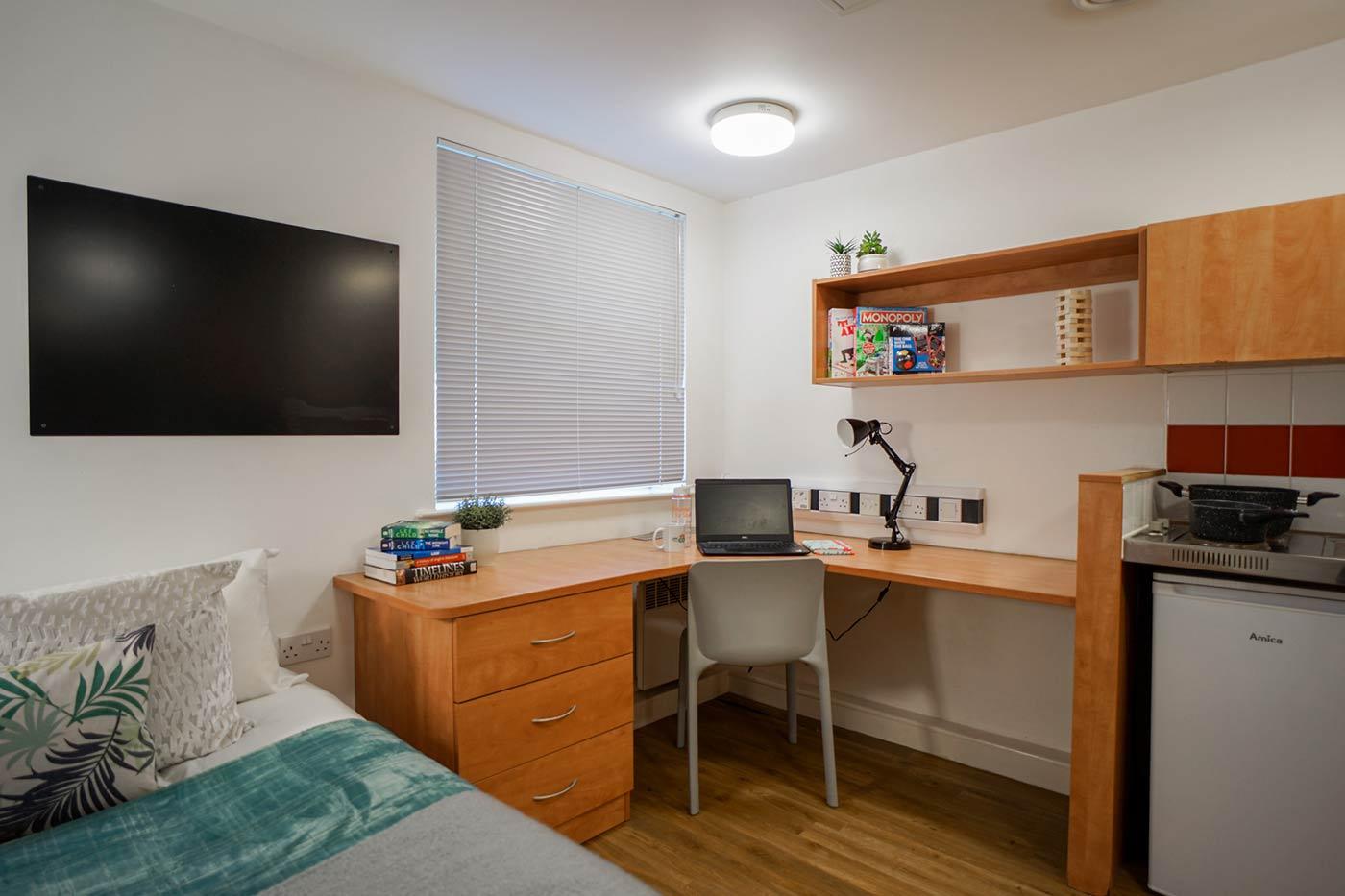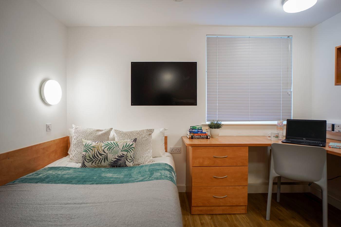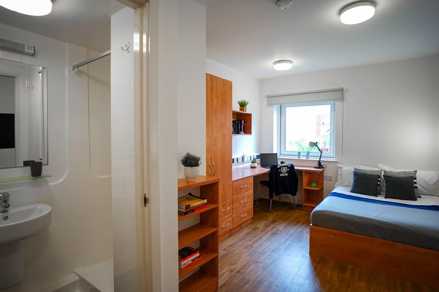 Our Platinum En-suite bedroom is the biggest En-Suite room at Exeter one, with double aspect windows, measuring 16m² with a ¾ bed, en-suite bathroom, study area and wardrobe. The shared area includes a lounge and kitchen area with TV and up to 100Mbps WIFI throughout.