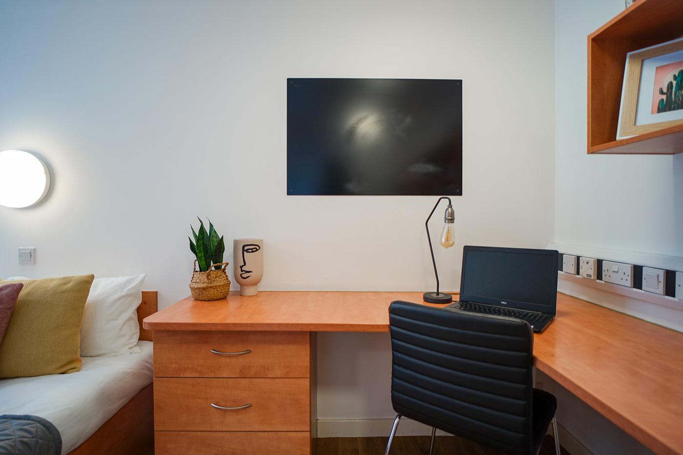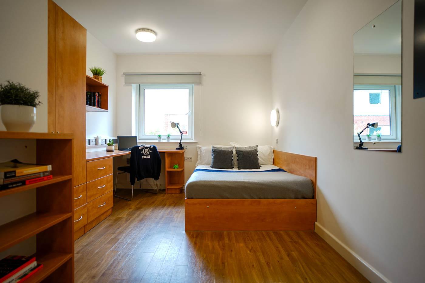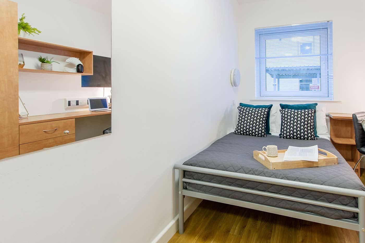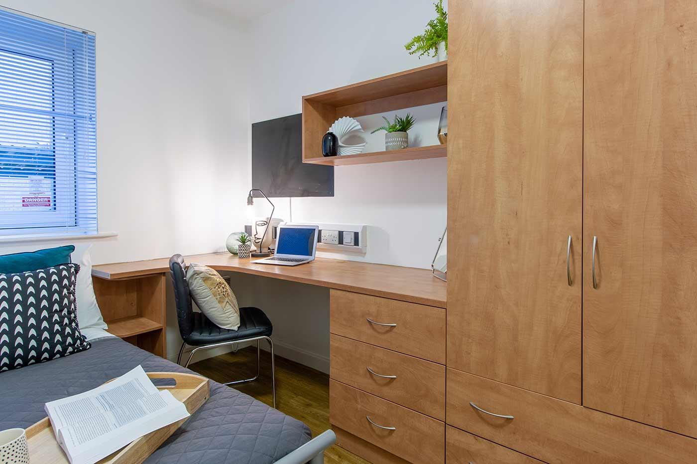 Our Platinum En-suite bedroom is the biggest En-Suite room at Exeter one, with double aspect windows, measuring 16m² with a ¾ bed, en-suite bathroom, study area and wardrobe. The shared area includes a lounge and kitchen area with TV and up to 100Mbps WIFI throughout.