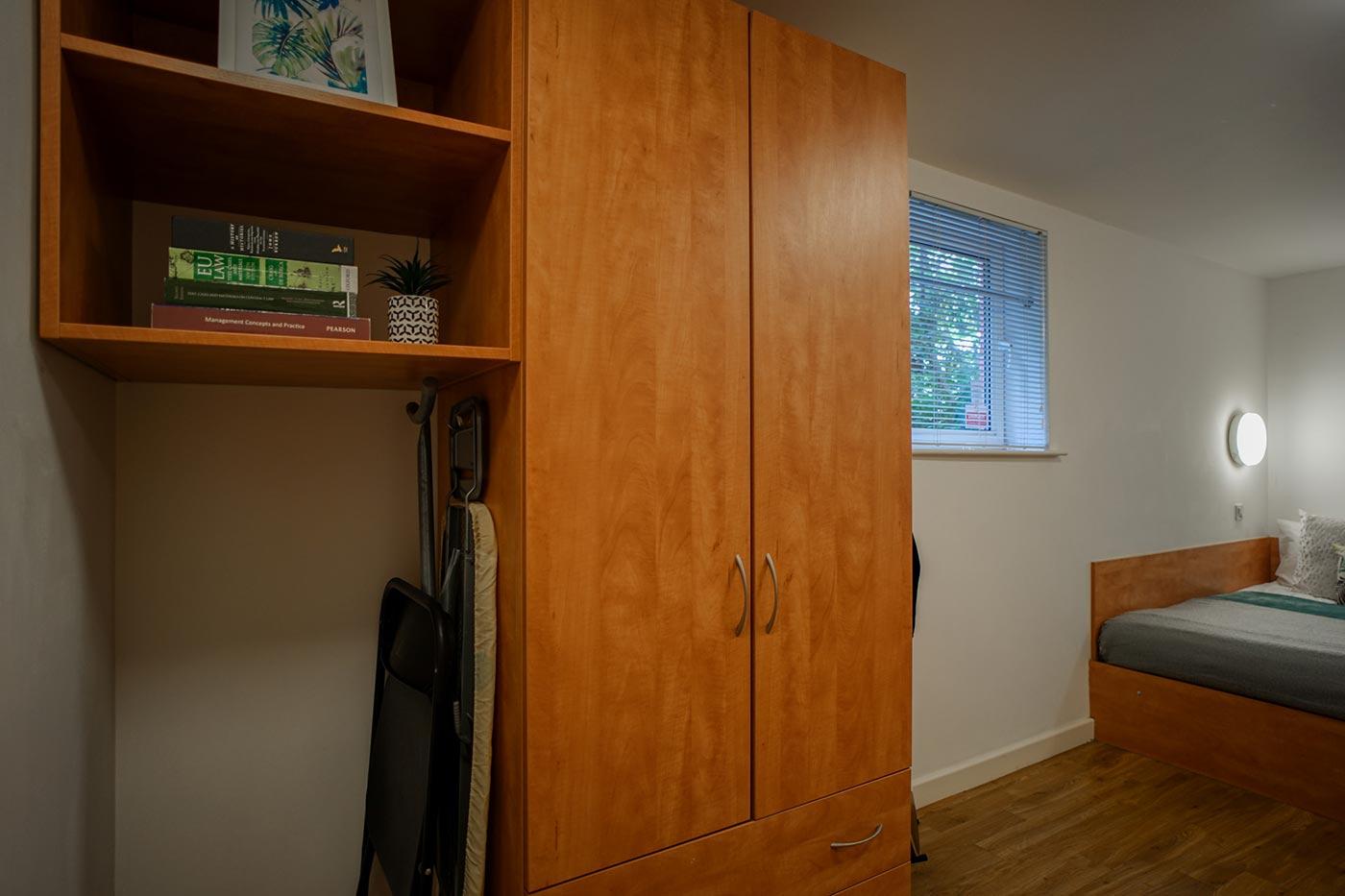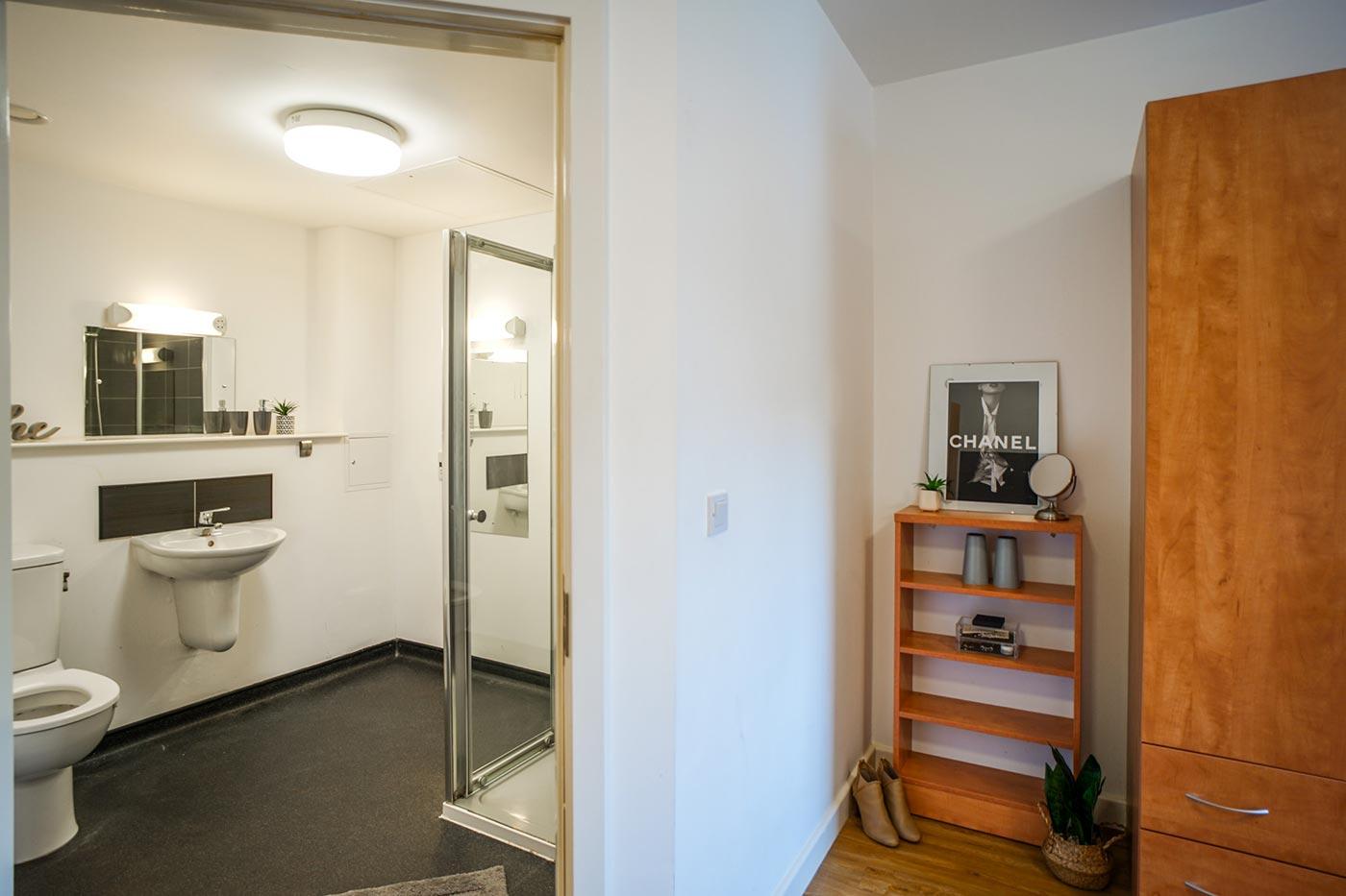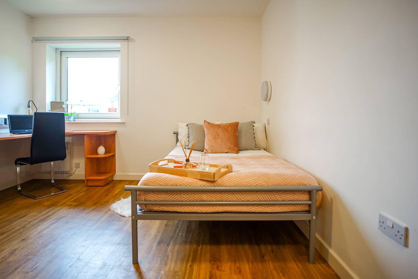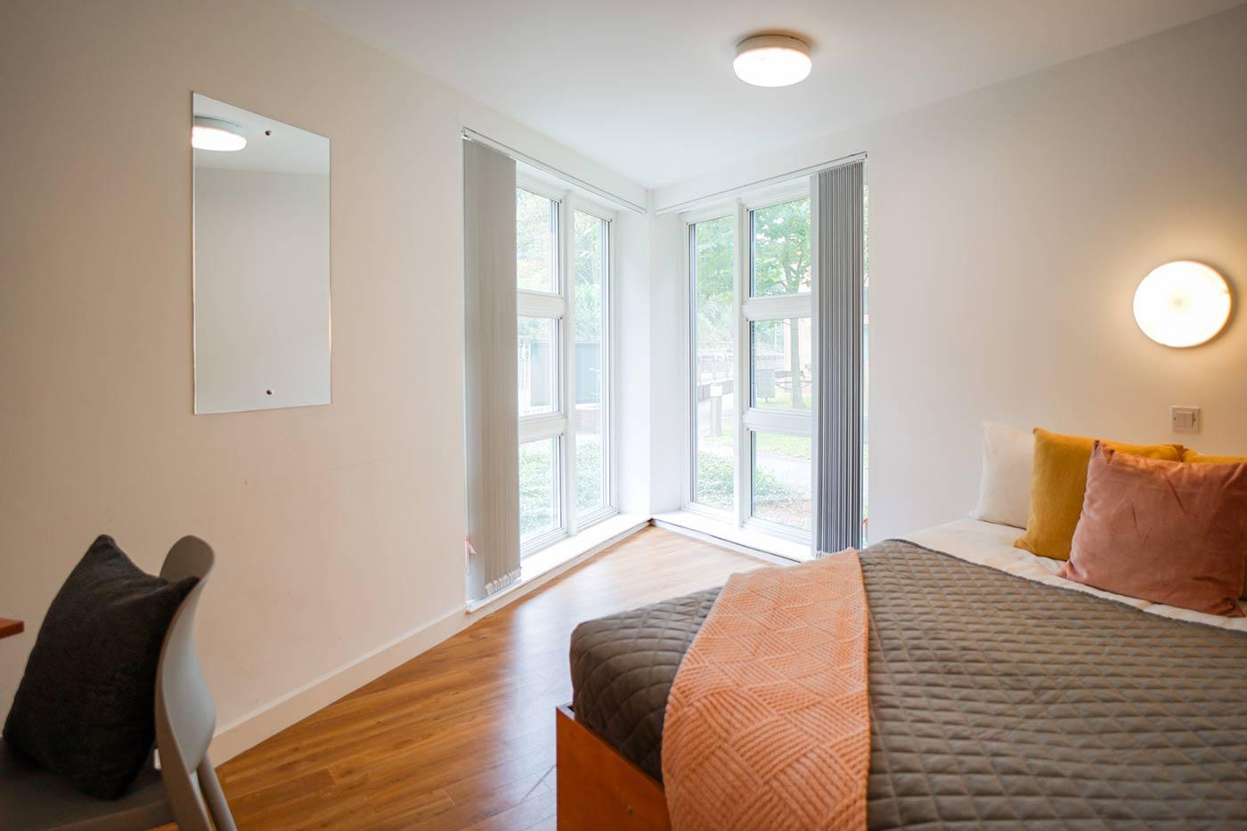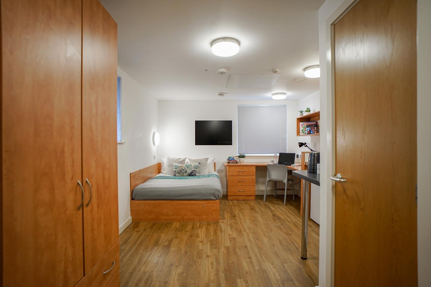 Our Platinum En-suite bedroom is the biggest En-Suite room at Exeter one, with double aspect windows, measuring 16m² with a ¾ bed, en-suite bathroom, study area and wardrobe. The shared area includes a lounge and kitchen area with TV and up to 100Mbps WIFI throughout.