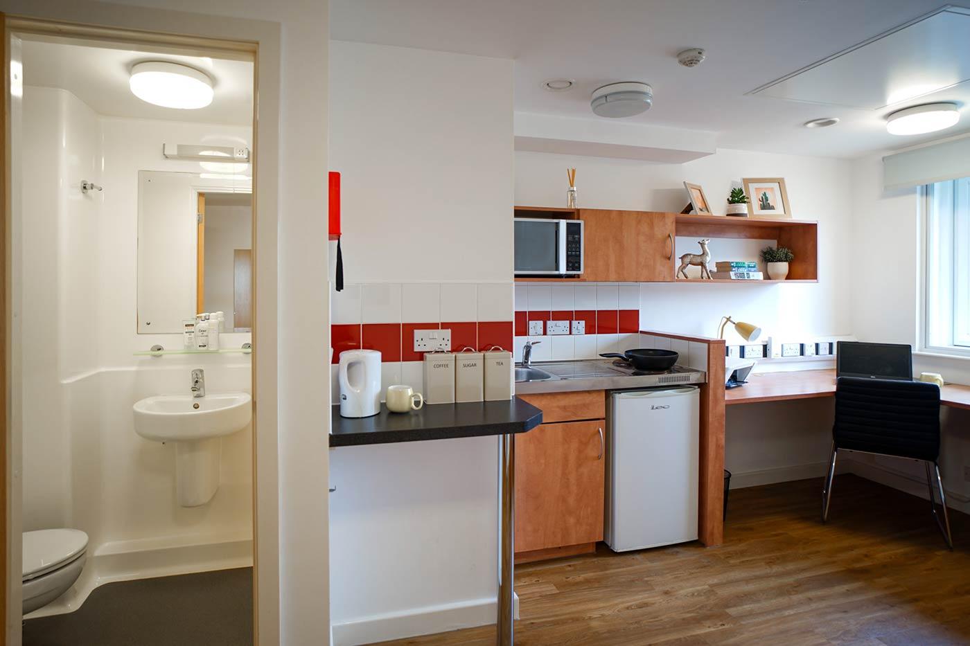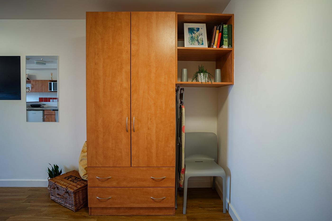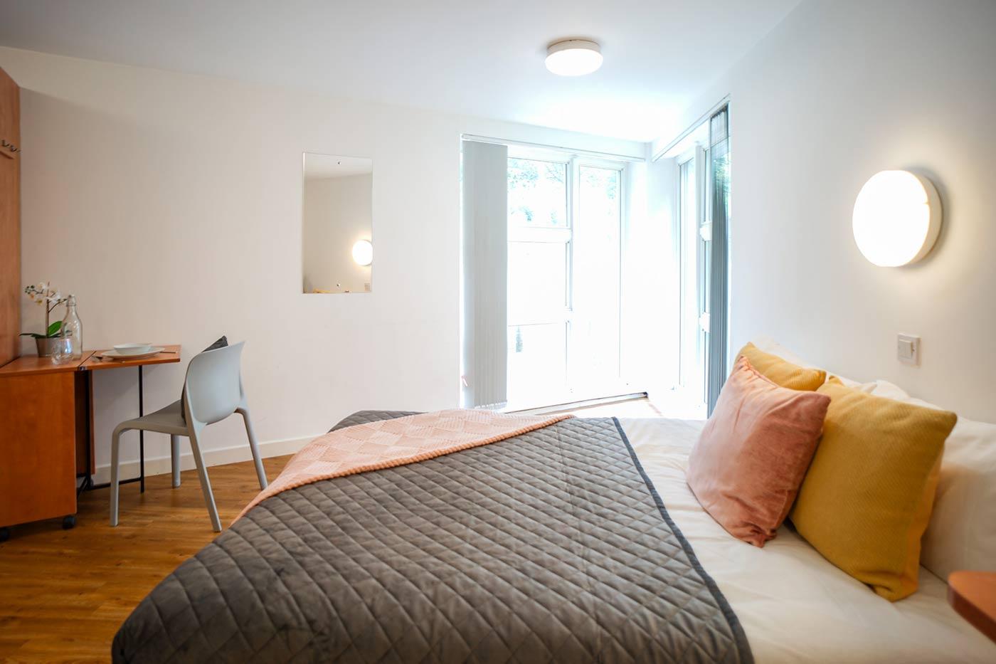Our Gold Studio is a spacious self-contained comfortable studio measuring 18m² featuring a double bed, kitchenette, en-suite bathroom, study area, wardrobe with super fast Wi-fi.