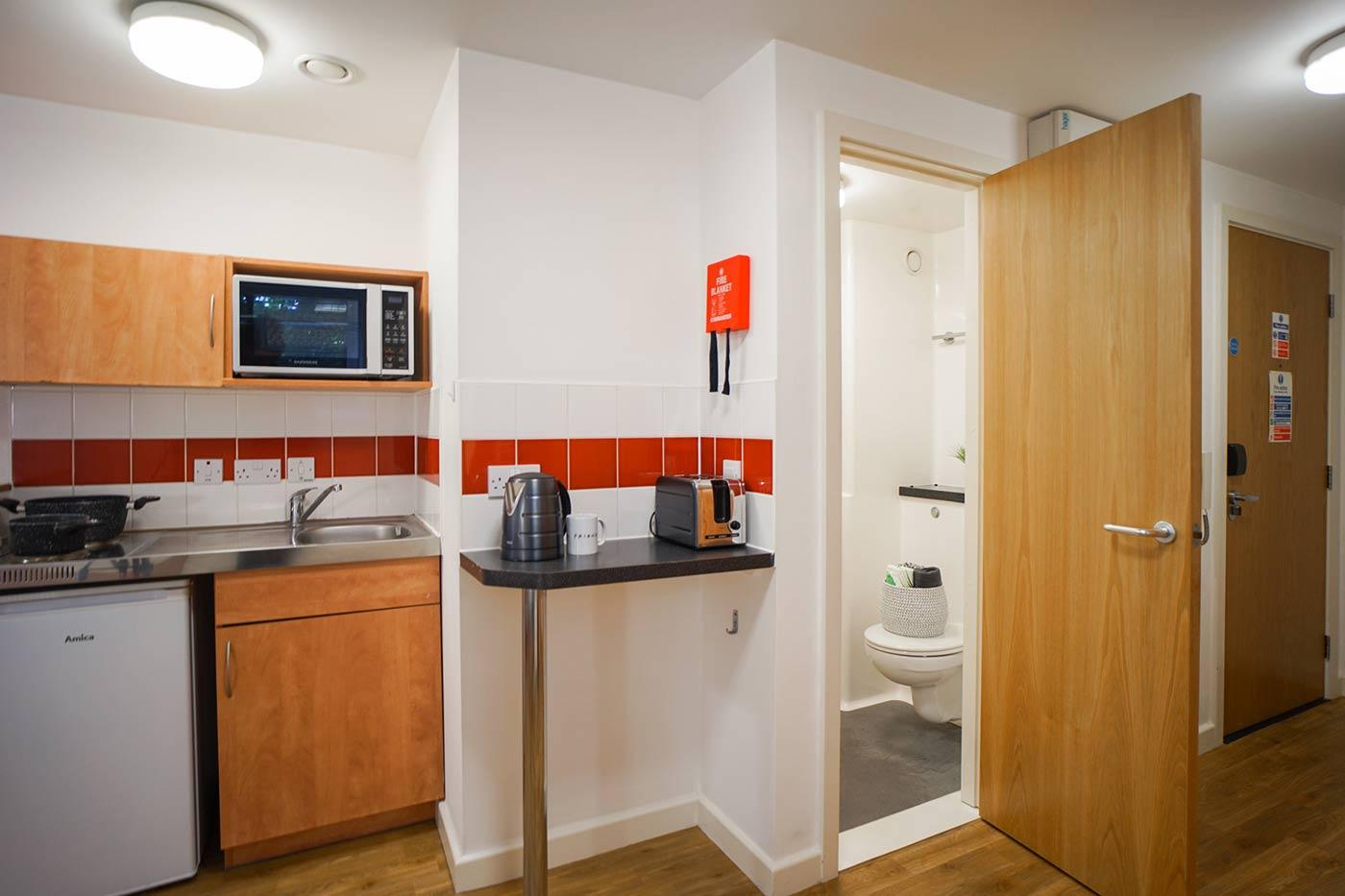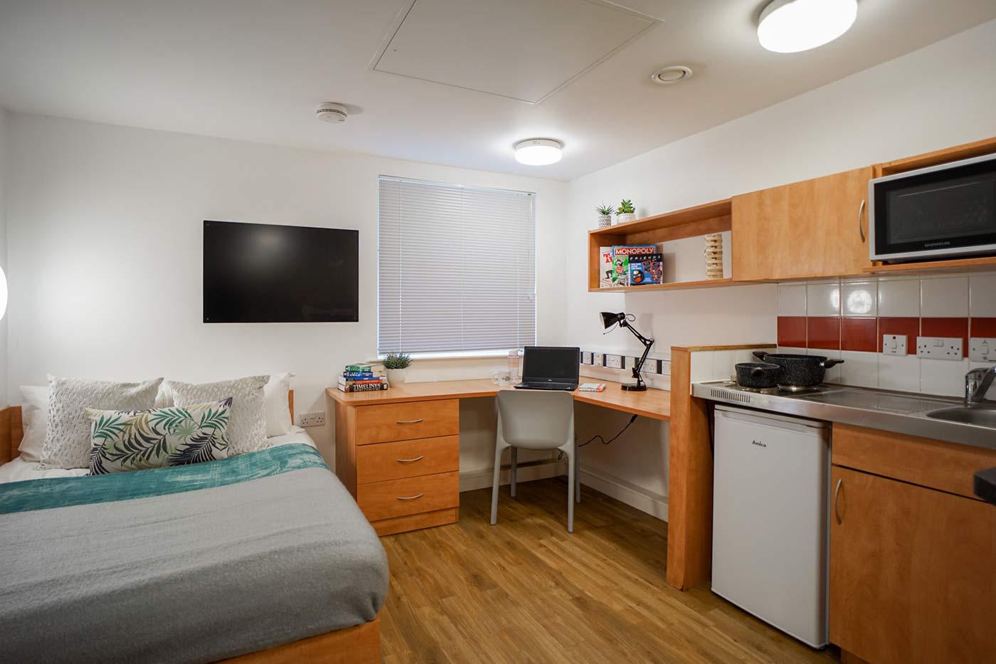 The Platinum Studio provides a spacious, high-quality living experience for students seeking premium privacy measuring 21m² with a double bed, kitchenette, en-suite bathroom, study area, wardrobe.