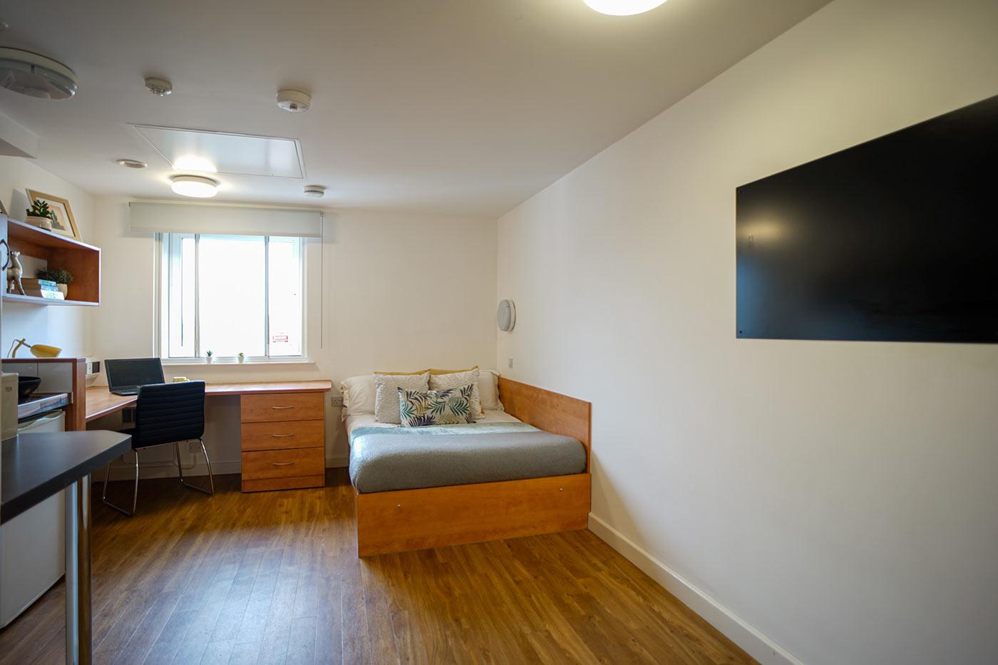 Our biggest studio at Exeter One – the Platinum Plus Studio. This room is a self-contained spacious studio with a floor to ceiling feature window measuring 23m² with a double bed, kitchenette, en-suite bathroom, study area, wardrobe and Wifi throughout.