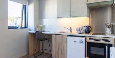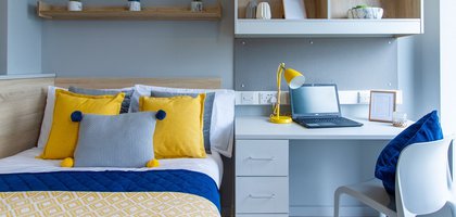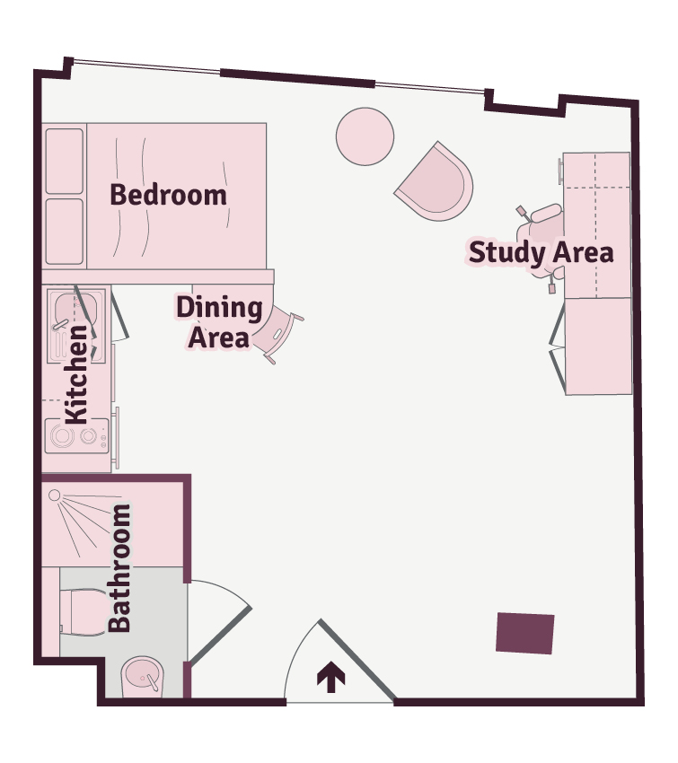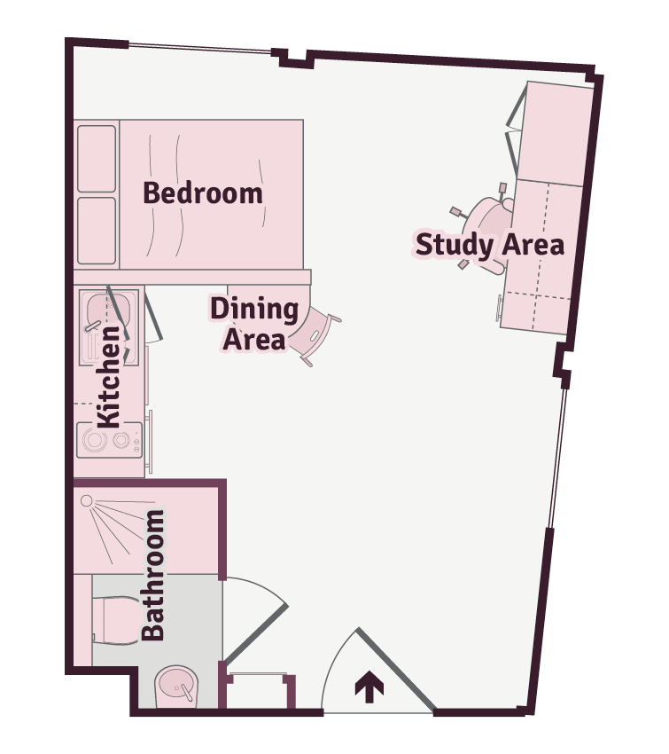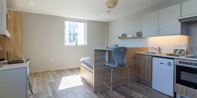 At approx. 20m2 the Premium Studio comes with three quarter sized bed, dining area, ample storage, mirror, study desk and chair and modern kitchenette with fridge-freezer, microwave oven and hob. This studio also has a fully fitted en-suite containing a large shower and stylish fittings. You will also have access to the cinema room and on-site gym.