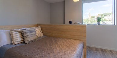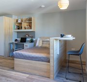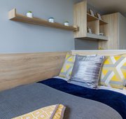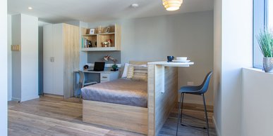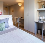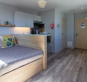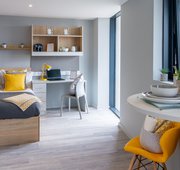 The Deluxe Studio measuring around 24-28m² comes with three quarter sized bed, dining area, ample storage, mirror, study desk and chair and modern kitchenette with fridge-freezer, microwave oven and hob. This studio also has a fully fitted en-suite containing a large shower and stylish fittings. You will also have access to the cinema room and on-site gym.