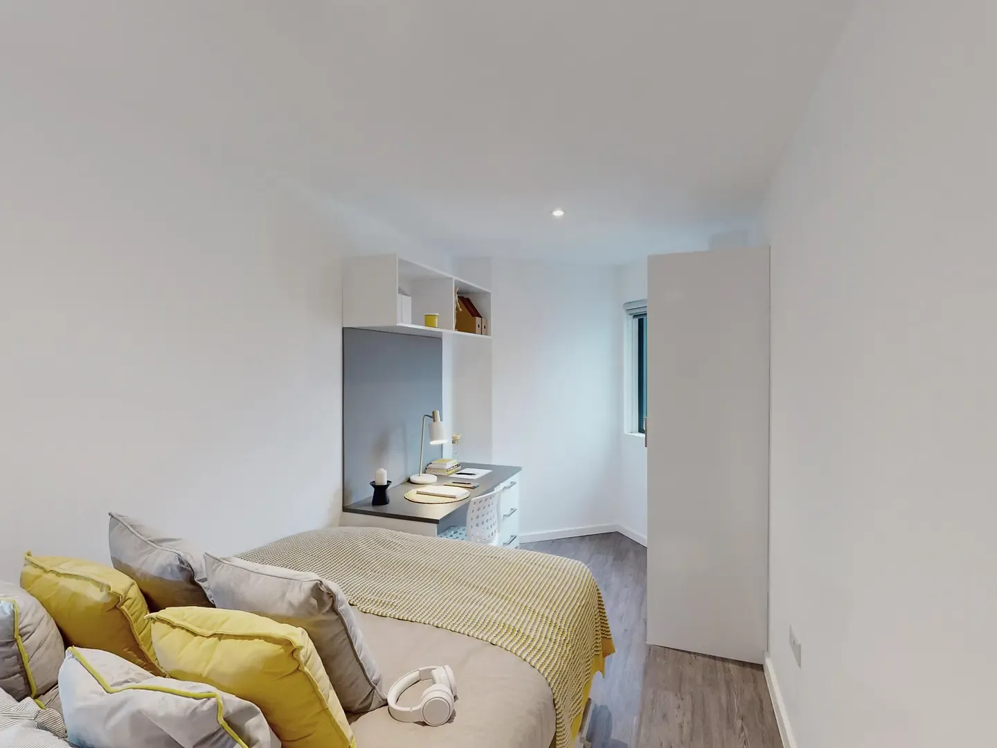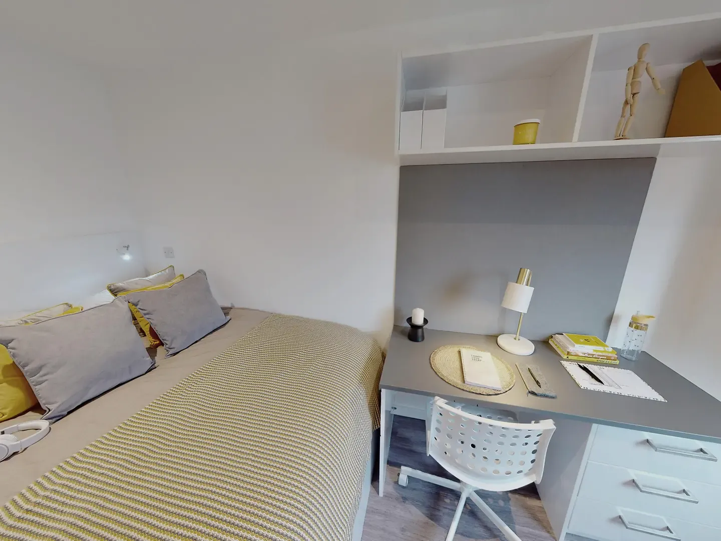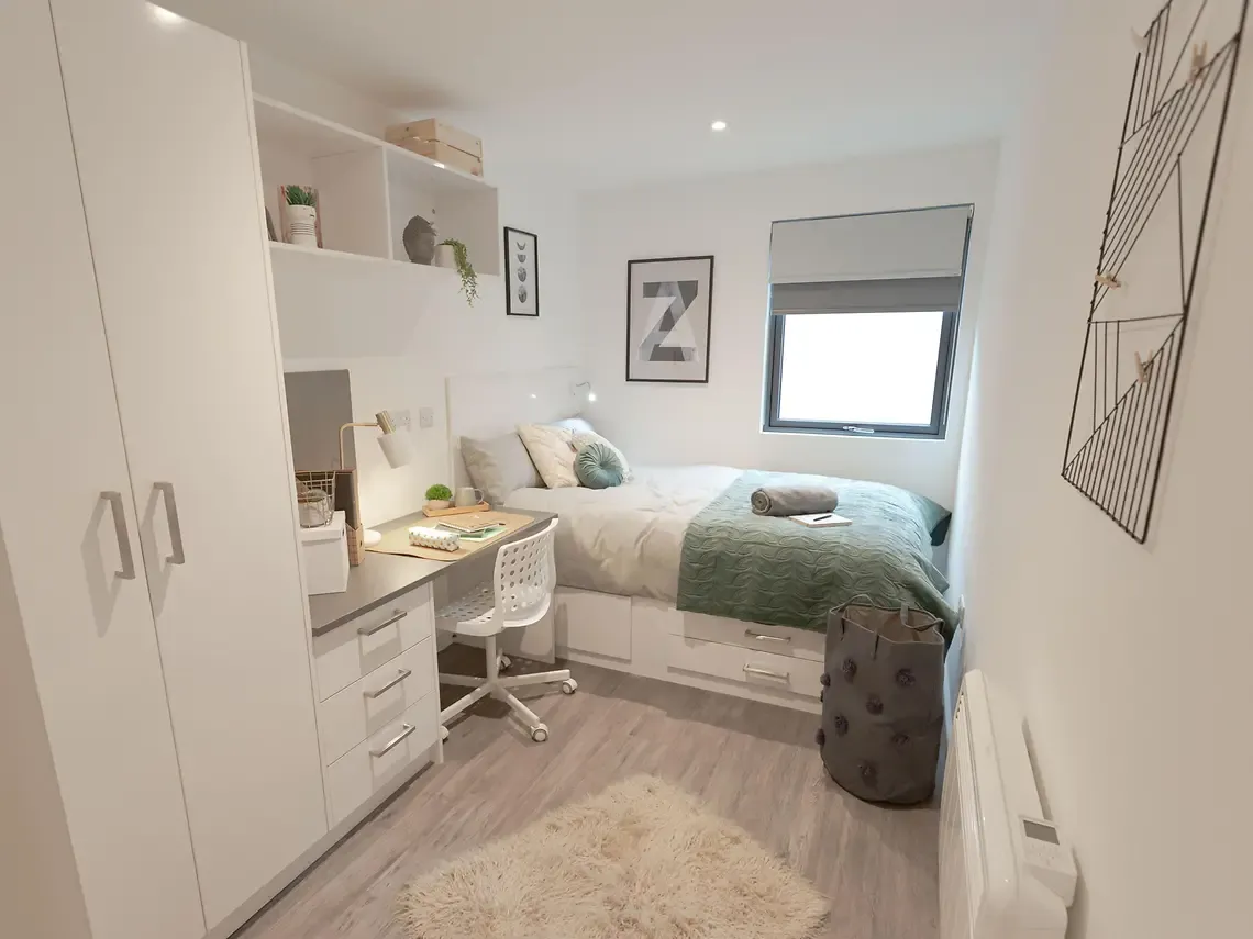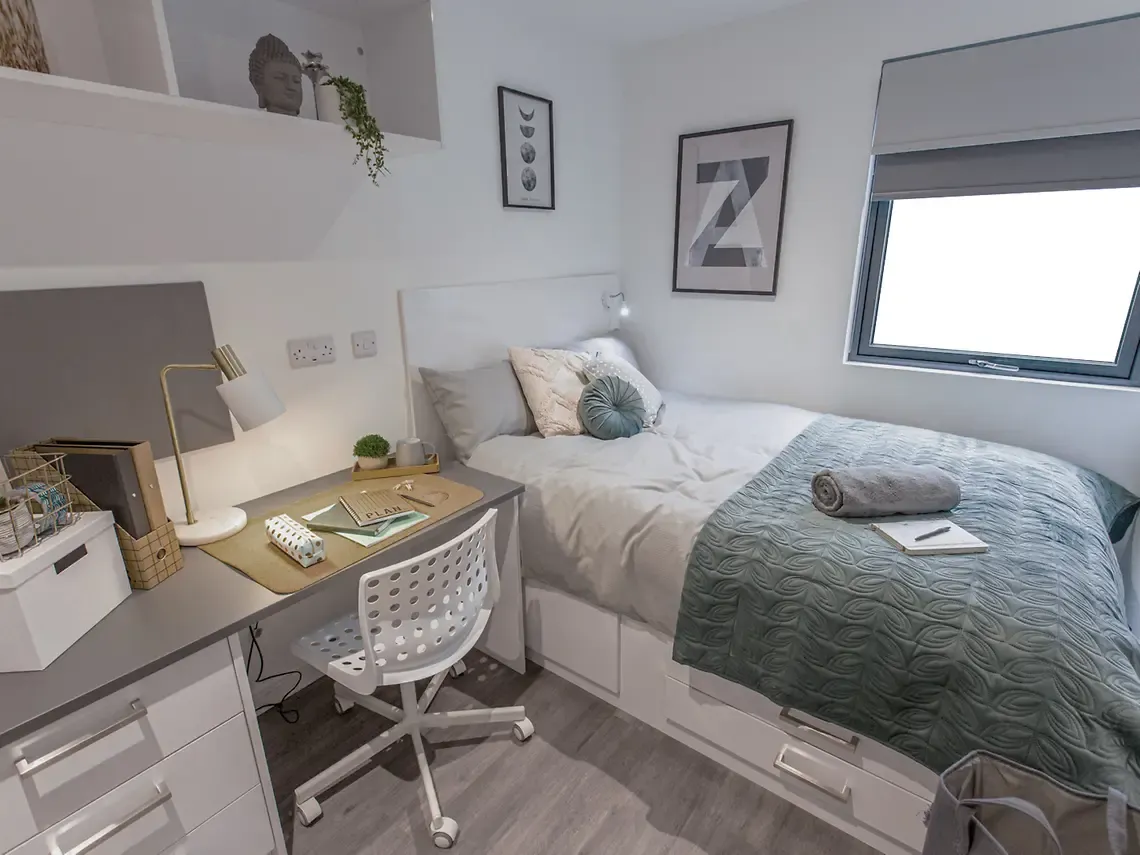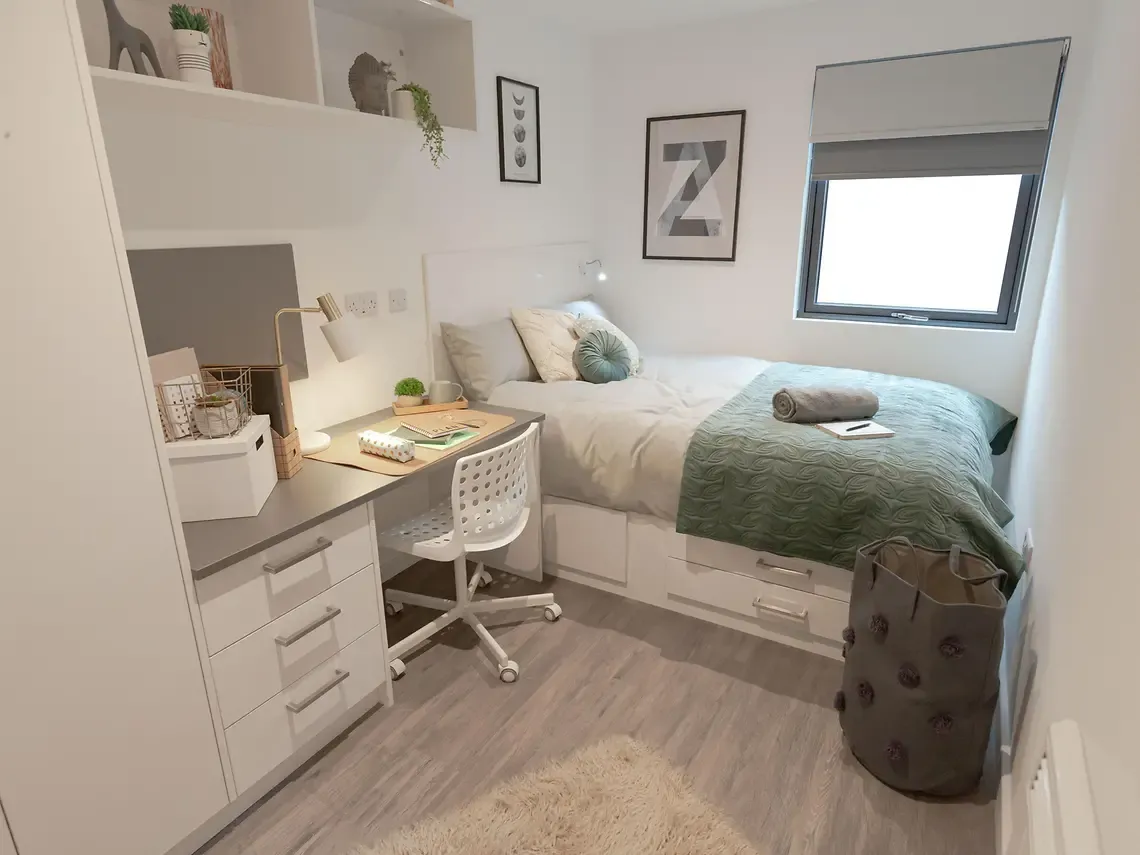 Located on the third floor of the building. Please note these rooms have a restricted view. What's in the room? Room sizes may vary from: 11m2 – 12m2 Double bed with under storage Private bathroom Study desk Desk chair Wardrobe double door Drawers Notice board Tall mirror Wall mounted shelf What’s in the kitchen/communal areas? Integrated oven Ceramic 4 ring hob Extractor hood Microwave Integrated fridge freezer Fire blanket Drainer sink Mixer tap Bin TV’s in all communal living spaces 3 seat bean bag sofa (2 per room) Dining table Dining chairs (6 per room) Coffee table Dishwasher
