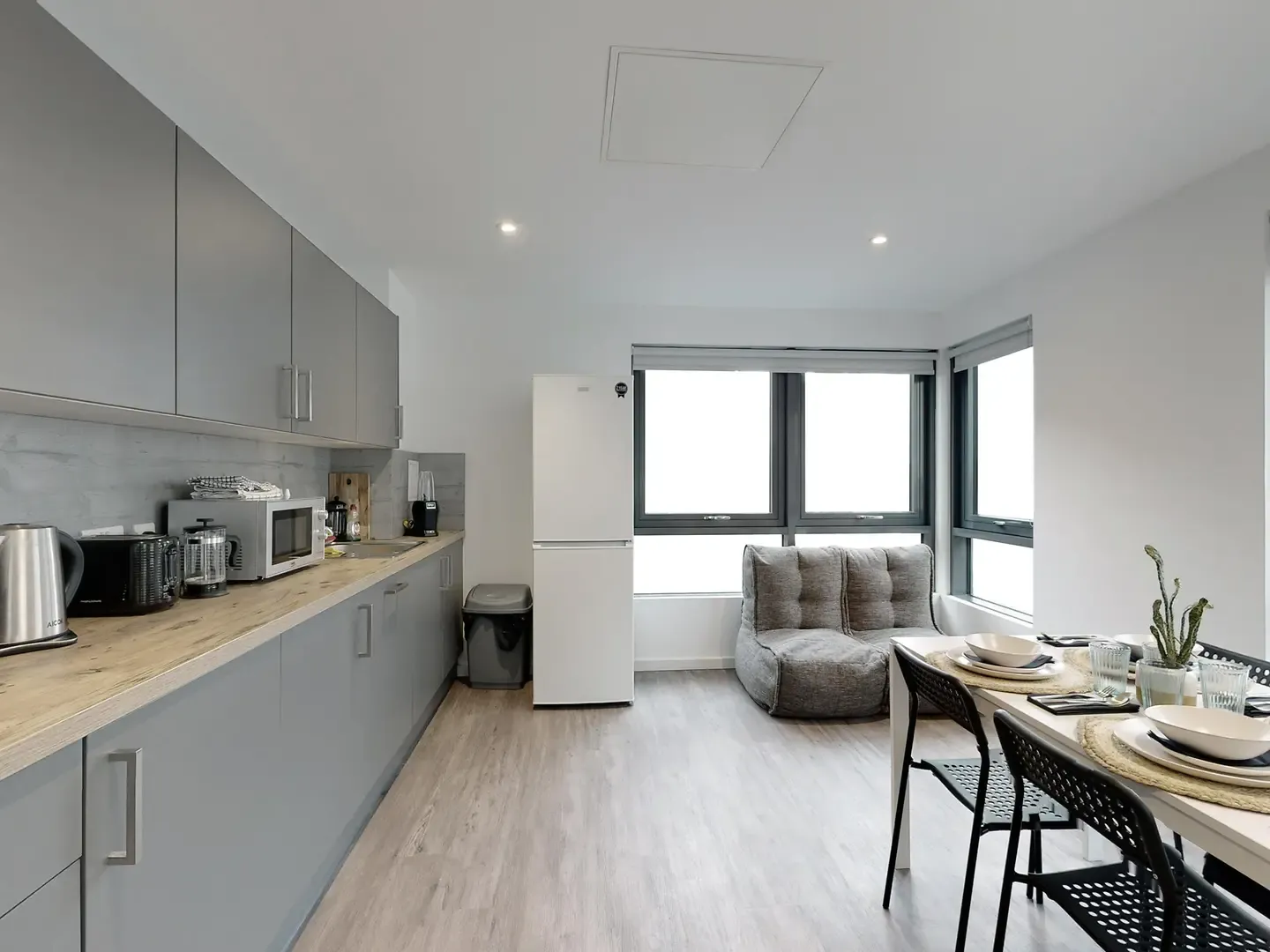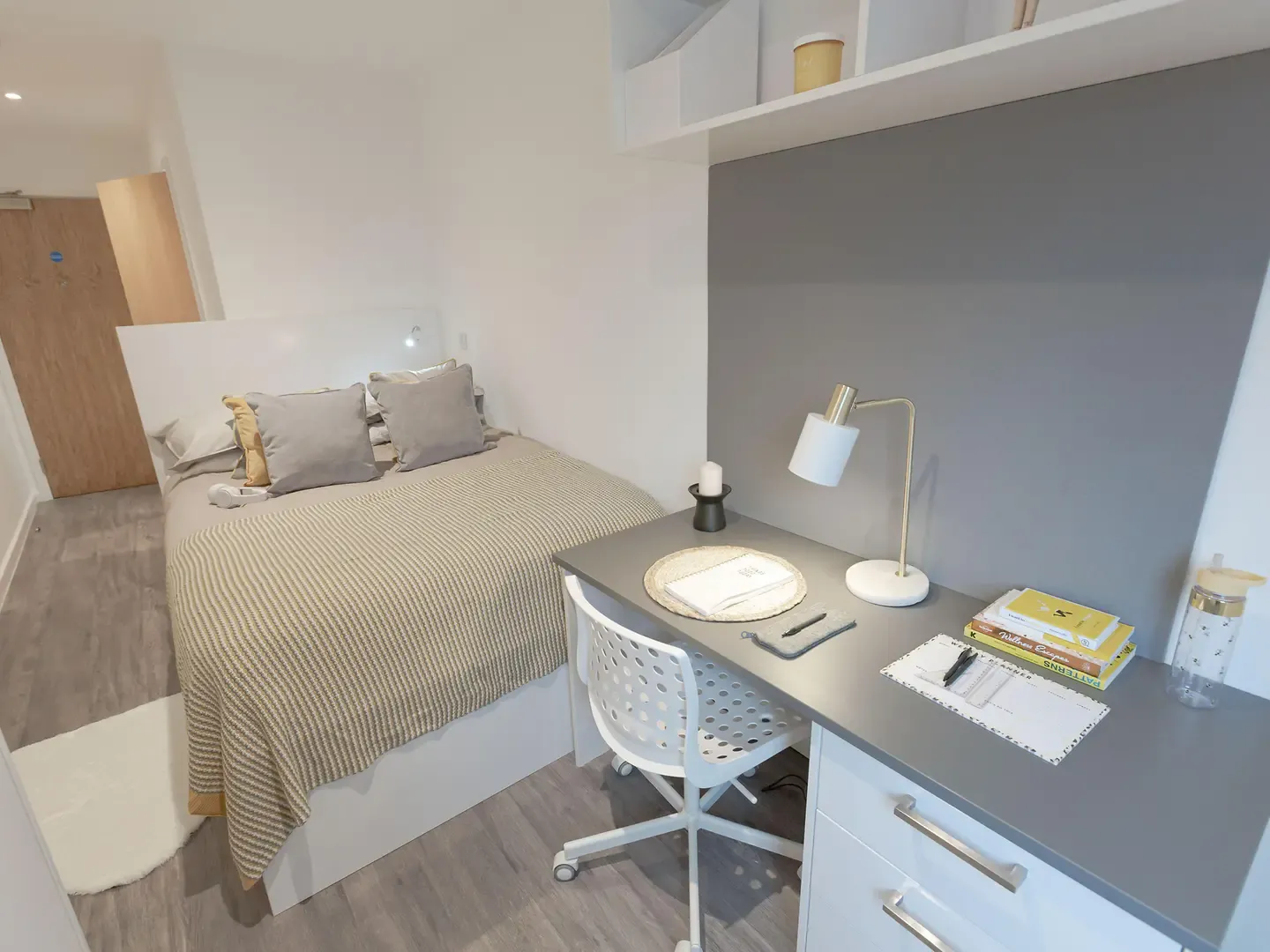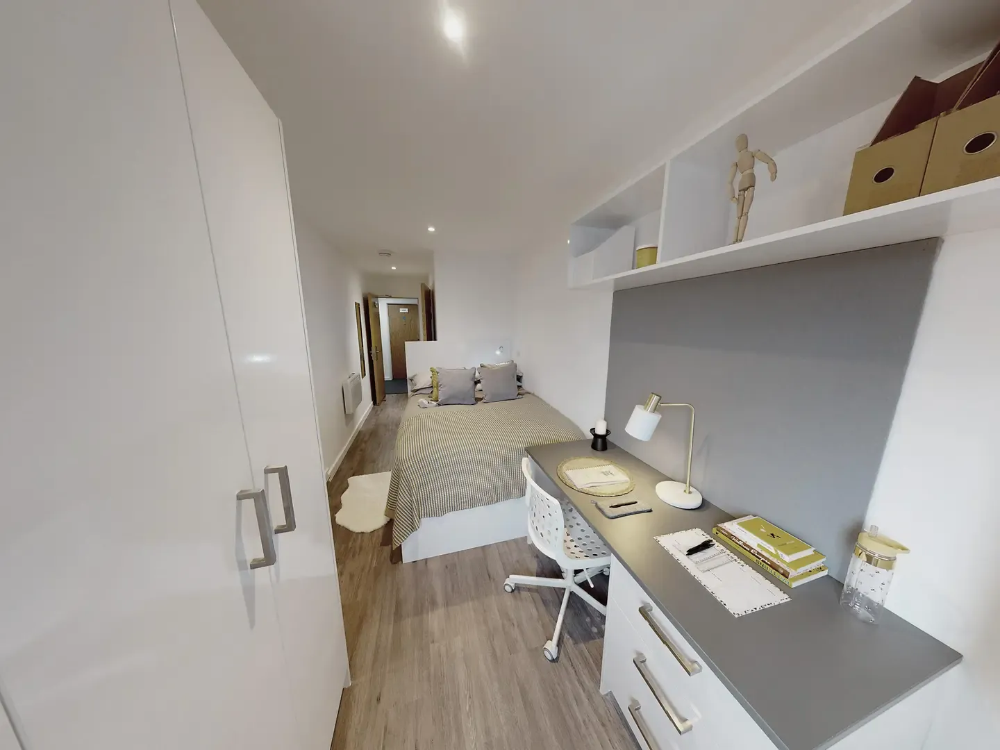 Located on the third floor of the building. What's in the room? Room sizes may vary from: 11m2 – 12m2 Double bed with under storage Private bathroom Study desk Desk chair Wardrobe double door Drawers Notice board Tall mirror Wall mounted shelf What’s in the kitchen/communal areas? Integrated oven Ceramic 4 ring hob Extractor hood Microwave Integrated fridge freezer Fire blanket Drainer sink Mixer tap Bin TV’s in all communal living spaces 3 seat bean bag sofa (2 per room) Dining table Dining chairs (6 per room) Coffee table Dishwasher