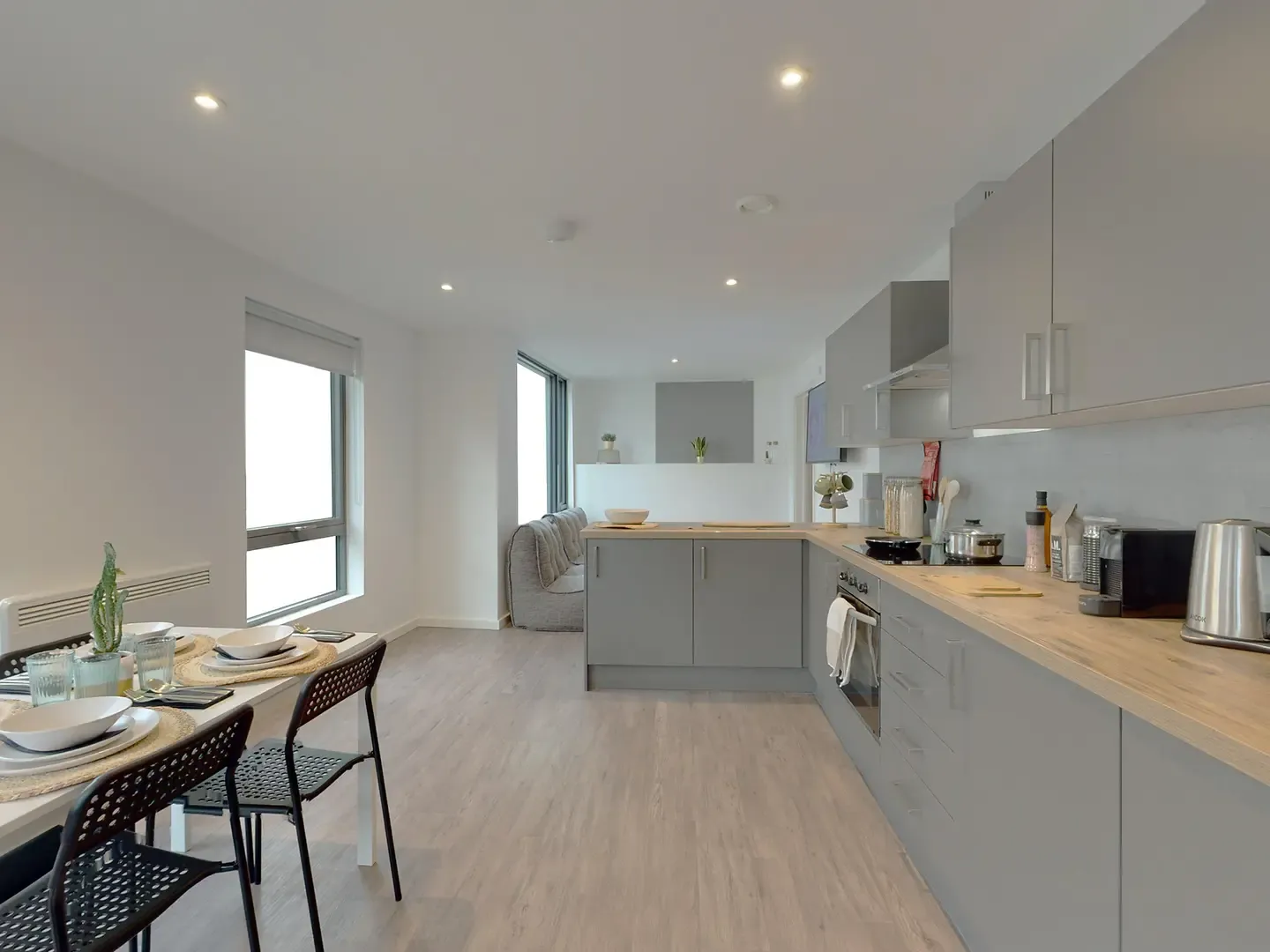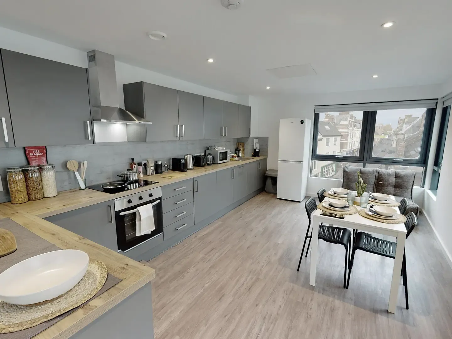 Located on the first and second floor of the building. What's in the room? Room sizes may vary from: 11m2 – 12m2 Double bed with under storage Private bathroom Study desk Desk chair Wardrobe double door Drawers Coat hooks Notice board Tall mirror Wall mounted shelf What’s in the kitchen/communal areas? Integrated oven Ceramic 4 ring hob Extractor hood Microwave Integrated fridge freezer Fire blanket Drainer sink Mixer tap Bin TV’s in all communal living spaces 3 seat bean bag sofa (2 per room) Dining table Dining chairs (6 per room) Coffee table