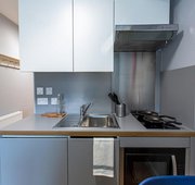 Your own private apartment, spread over 2 floors. Your own bedroom area with small double bed, storage and workspace, overlooking your private mini-kitchen and living area. Don't forget the en suite shower room! Average room 19 sqm.