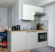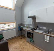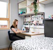 Check out our 16sqm studio rooms, which have a small double bed and an en-suite shower. Each has a private kitchen and your own dining area. And theres a study space with desk and chair, and plenty of storage.