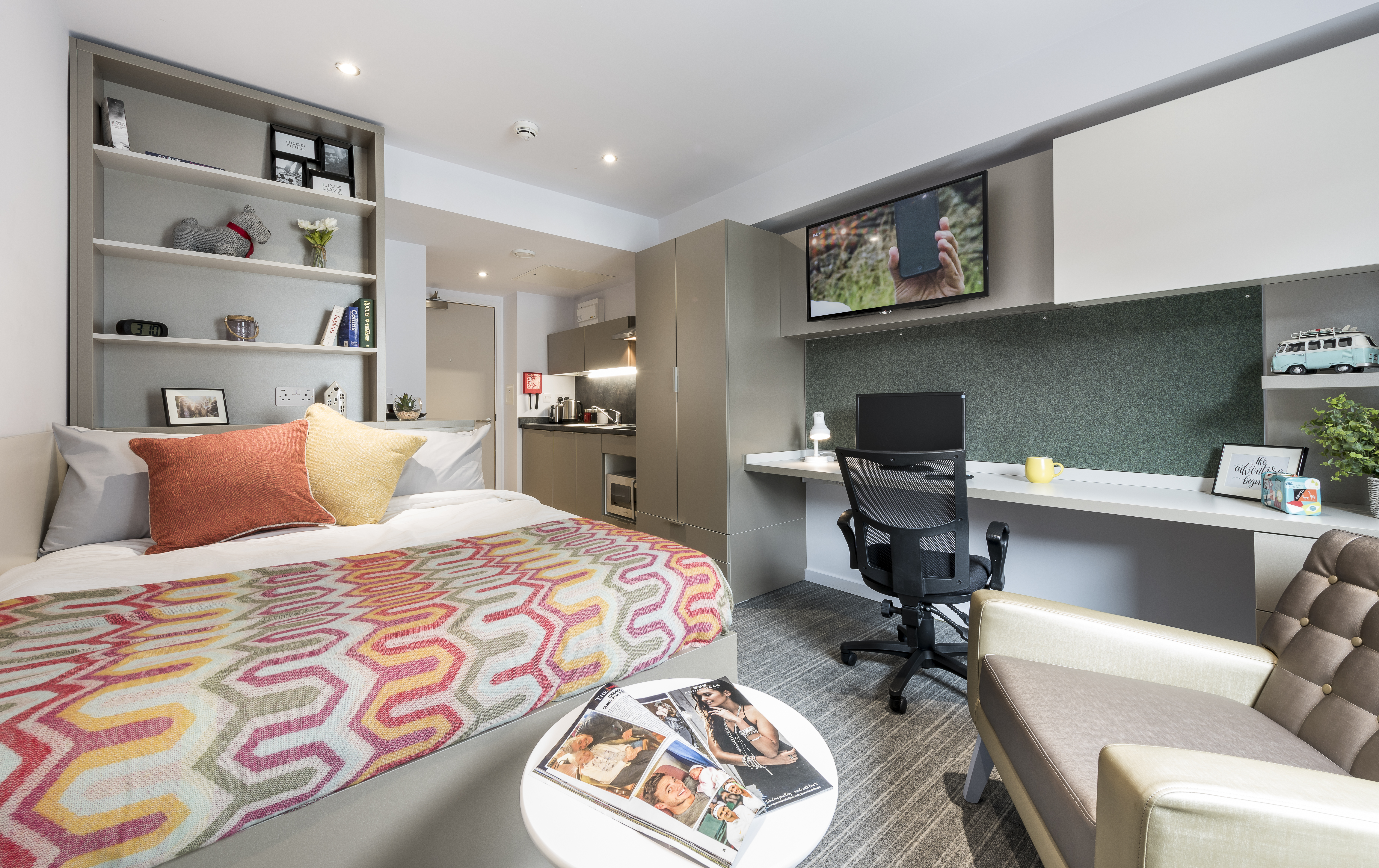 Our Gold Studios are suitable for single or double occupancy due to their size and spacious layout. Each studio features a comfortable double bed, built in desk and desk chair, fitted kitchen with modern appliances including ceramic hob, microwave, and fridge/freezer. Plenty of storage and wardrobe space, your own high quality bathroom and 40” Smart TV.