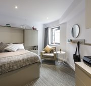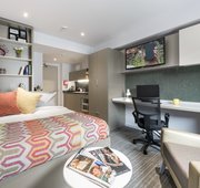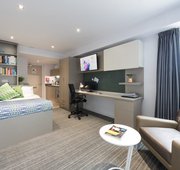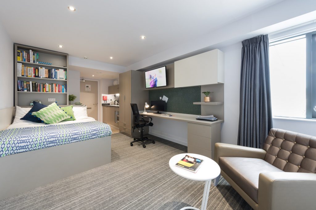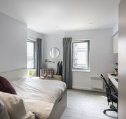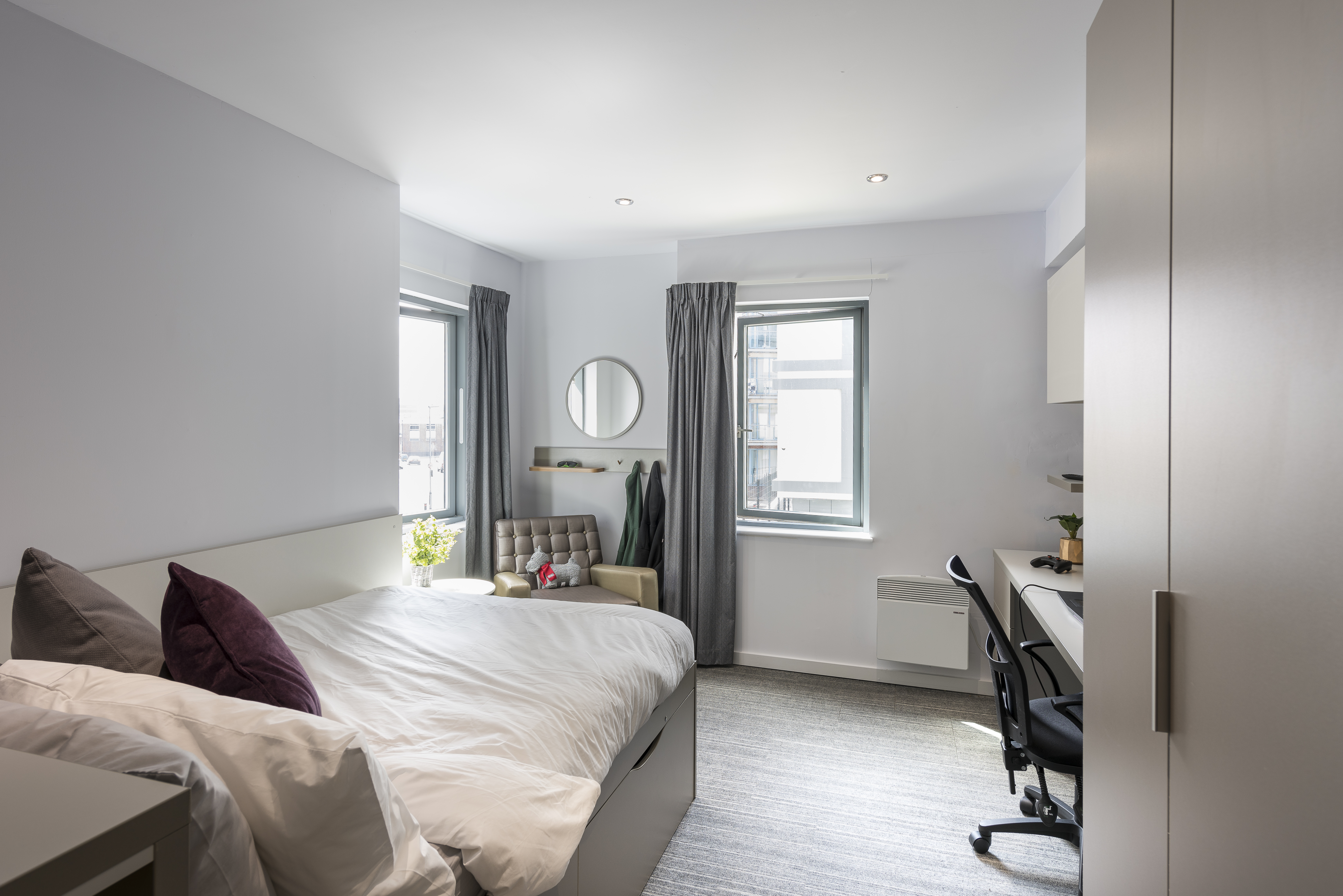 Our Silver Studios are a little more spacious than our Bronze studios, some even have the added feature of large floor to wall windows allowing for plenty of light. They feature a comfortable double bed, built in desk and desk chair, fitted kitchen with modern appliances including ceramic hob, microwave, and fridge/freezer. Plenty of storage and wardrobe space, your own high quality bathroom and 40” Smart TV.