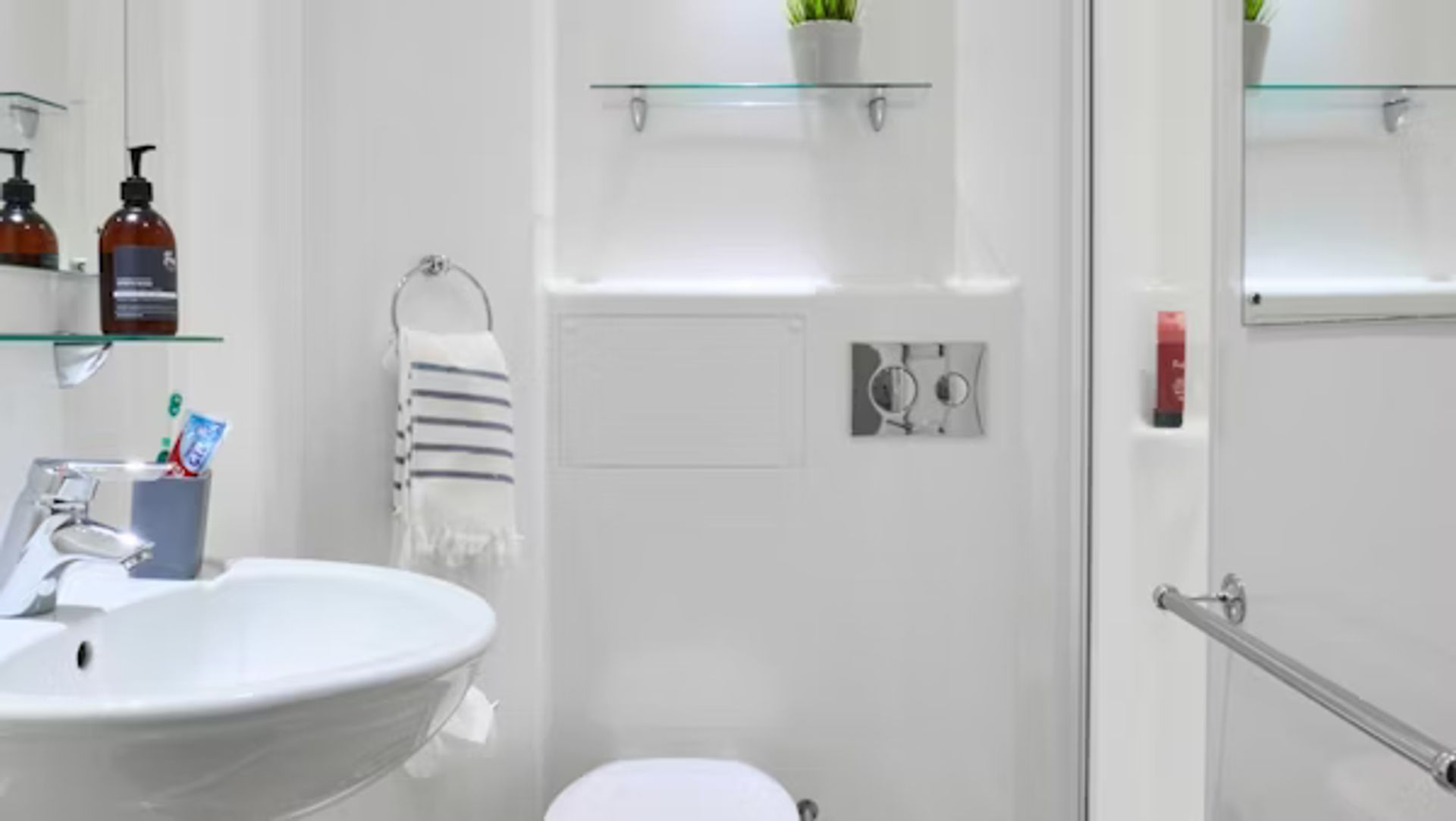 Our Deluxe Ensuite provides a compact and functional living space, ranging from 12 m². Featuring a single bed, wardrobe, bedside table, shelving unit, and 3 storage boxes, it’s perfect for students. The large desk and chair, along with bookshelves and a noticeboard, ensure a productive study environment. Enjoy the convenience of your own ensuite washroom. The shared kitchen is equipped with essential appliances, including a fridge/freezer, microwave, toaster, kettle, oven, and hob. The shared lounge area includes a sofa, coffee table, and Freeview TV.