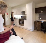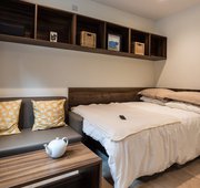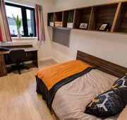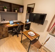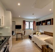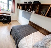 Experience comfortable and independent living in our spacious 1-bed Apartment, starting from 39 m². This well-designed space features a cosy 3/4 double bed, and ample storage with a wardrobe, bedside table, shelving unit, and 3 storage boxes. Enjoy a large desk and chair for study sessions, alongside bookshelves and a noticeboard for organising your academic materials. The apartment includes central heating and an ensuite washroom for your privacy. The open-plan kitchen comes with a fridge/freezer, microwave, toaster, kettle, oven, and hob. The dining area has a table and chairs, while the lounge area offers a sofa, coffee table, and Freeview TV.