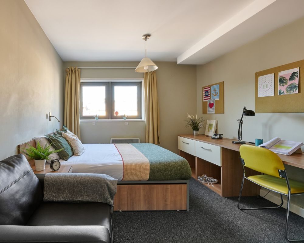 Fully furnished studio with private bathroom, 3/4 double bed and private open plan kitchen. Plenty of storage including wardrobe, bedside table, drawers and underbed storage. Large desk, chair, bookshelves and noticeboard for studying.