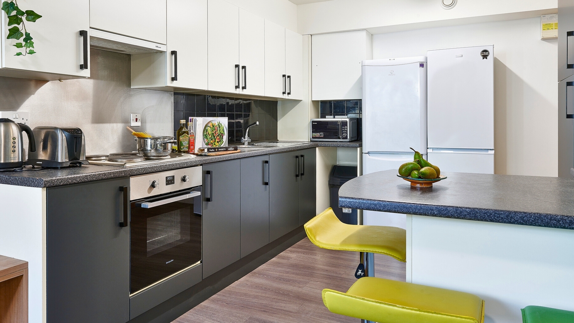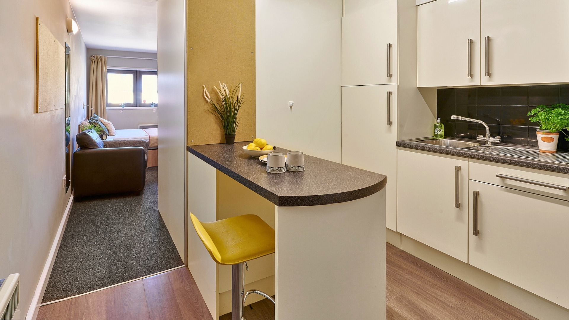 Fully furnished studio with private bathroom, 3/4 double bed and private open plan kitchen. Plenty of storage including wardrobe, bedside table, drawers and underbed storage. Large desk, chair, bookshelves and noticeboard for studying. Free Wi-Fi & Internet plus contents insurance and all your bills included as standard.