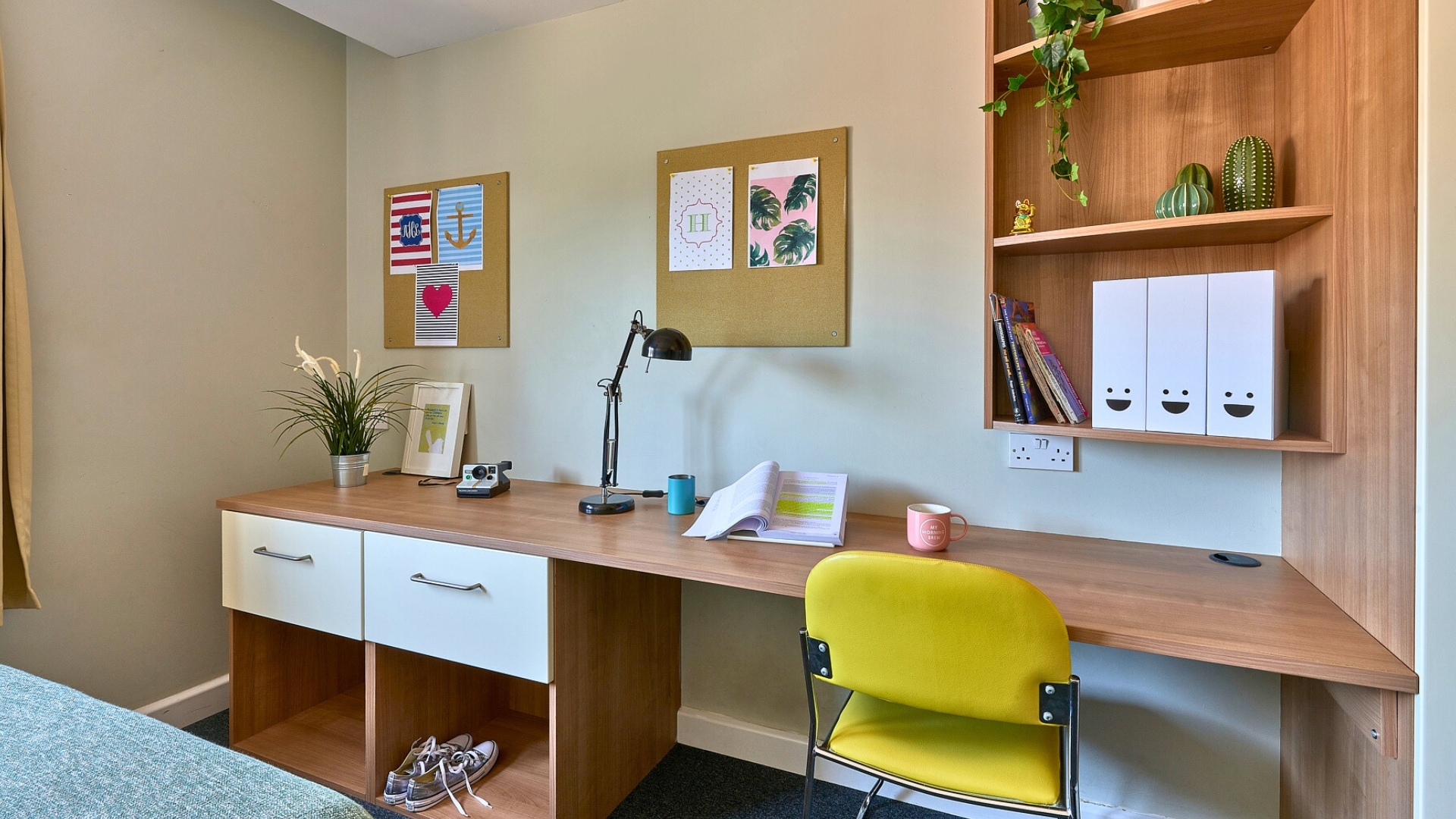 Fully furnished en-suite bedroom with private bathroom and shared kitchen. 3/4 double bed, plenty of storage including wardrobe, bedside table, drawers and underbed storage. Large desk, chair, bookshelves and noticeboard for studying. Free Wi-Fi & Internet plus contents insurance and all your bills included as standard.