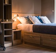 The Gold Plus Studio stands out with its 23 square metres of well-planned space, adding an extra touch of luxury to student living. The comfortable bed invites you to unwind, while the study desk and chair make it easy to stay productive. With ample storage space to store your belongings plus a private bathroom and a kitchen equipped with essentials , this studio allows for seamless, independent living.
