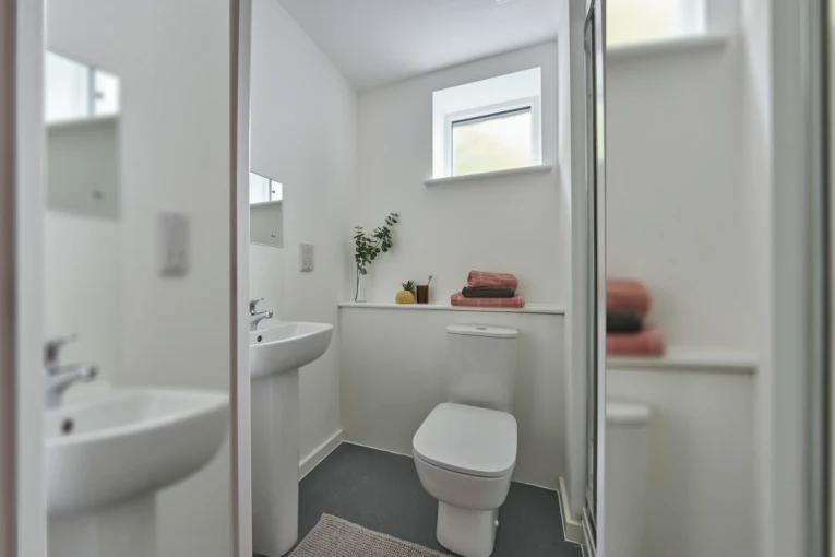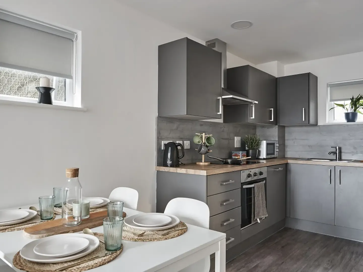 Room sizes vary from 12.5m2 13m2 - Double bed with under storage - En-suite bathroom - Bedhead light - Study desk - Desk chair - Wardrobe - Drawers - Notice board - Tall mirror - Wall mounted shelf - Whats in the kitchen? - Freestanding oven - Integrated 4 ring hob - Extractor hood - Microwave - Fridge Freezer freestanding - Under counter dishwasher - Dining table and chairs - Bean bag chairs - TV - Coffee table - Fire blanket - Drainer sink - Mixer tap - General waste & recycle bins --- Description --- Made up of 3-5 bed flats. Speak to the site team for more information and availability.