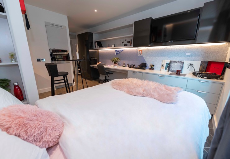 Room Size 21.3-23.3m², Our Platinum Plus Studios provide you with access to all communal areas plus your own private space for lounging, cooking, have friends around and great south facing views with sunlight all year around.