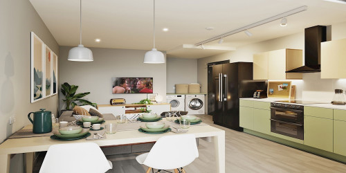 Small double bed, desk chair, wardrobe, bedside table or shelving and underbed storage Shared living, kitchen and dining area, fully fitted kitchen, washing machine, tumble dryer, dishwasher, smart TV, sofa and dining table with chair