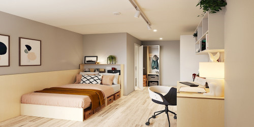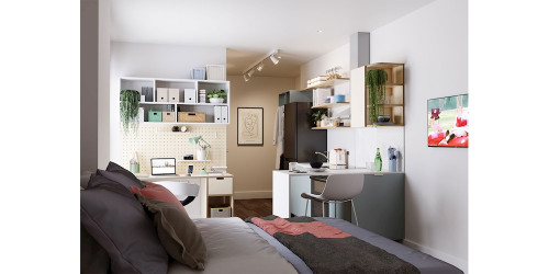 17.4-19m² | Small double bed, desk chair, wardrobe, bedside table or shelving and underbed storage Shared living, kitchen and dining area, fully fitted kitchen, washing machine, tumble dryer, dishwasher, smart TV, sofa and dining table with chairs