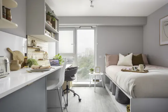 18.6-21m² | Double bed, desk chair, bedside table or shelving, wardrobe and underbed storage En-suite with a smart TV, fully fitted kitchen with an integrated washer-dryer and dishwasher and breakfast bar stool