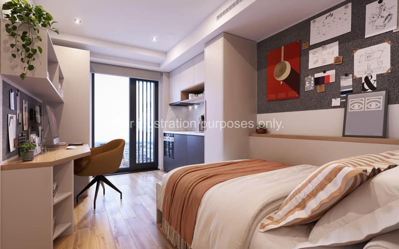 The expansive floor plan provides optimal space for both studying and relaxation. Your luxury home has been meticulously curated with floor-to-ceiling windows, a premium bed, a clearly defined study area for focussed moments, and substantial wardrobe storage. Enjoy the complete autonomy of your own modern kitchen and a spacious, contemporary private bathroom.